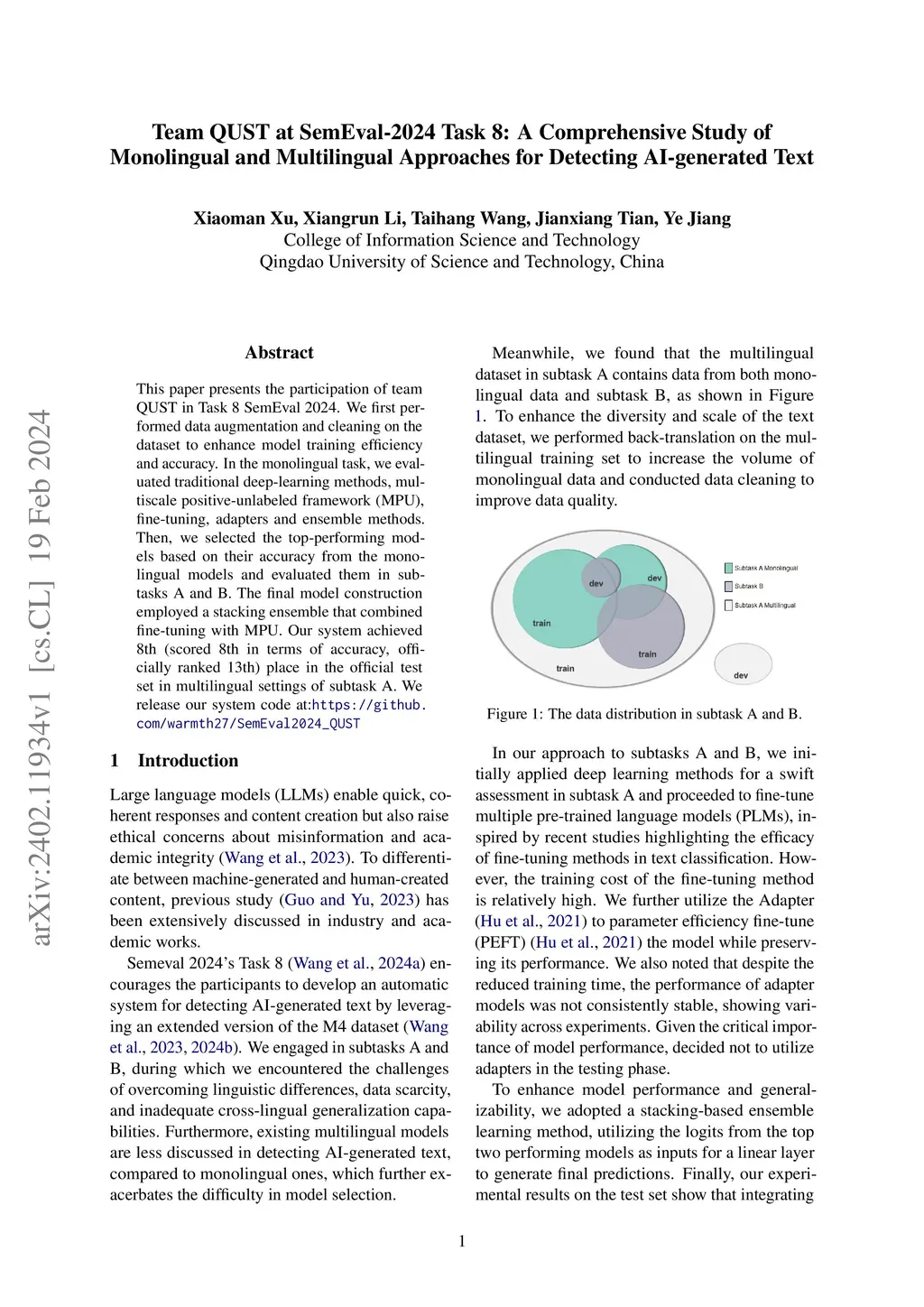 This paper presents the participation of team QUST in Task 8 SemEval 2024. We first performed data augmentation and cleaning on the dataset to enhance model training efficiency and accuracy. In the monolingual task, we evaluated traditional deep-learning methods, multiscale positive-unlabeled framework (MPU), fine-tuning, adapters and ensemble methods. Then, we selected the top-performing models based on their accuracy from the monolingual models and evaluated them in subtasks A and B. The final model construction employed a stacking ensemble that combined fine-tuning with MPU. Our system achieved 8th (scored 8th in terms of accuracy, officially ranked 13th) place in the official test set in multilingual settings of subtask A. We release our system code at:https://github.com/warmth27/SemEval2024_QUST