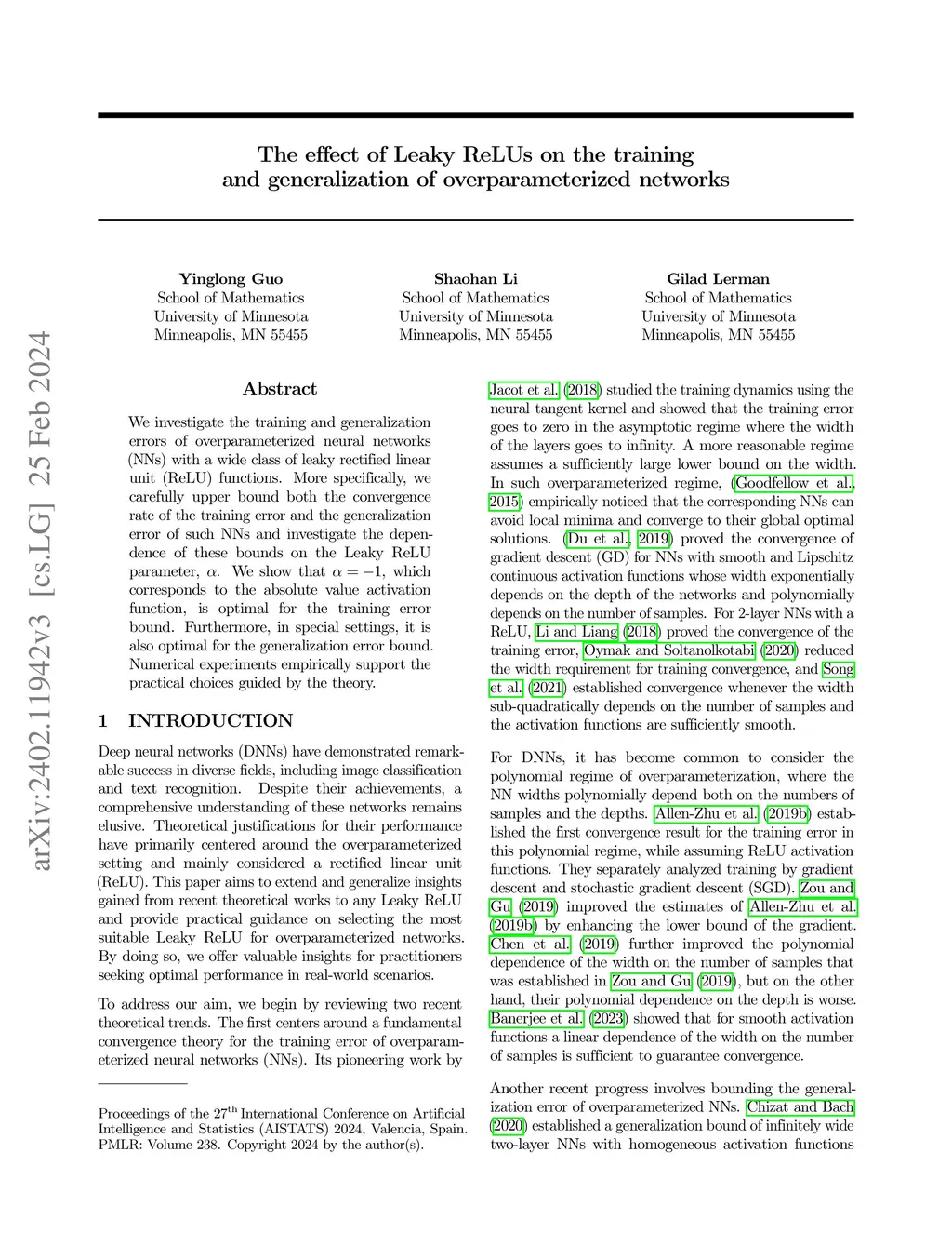 We investigate the training and generalization errors of overparameterized neural networks (NNs) with a wide class of leaky rectified linear unit (ReLU) functions. More specifically, we carefully upper bound both the convergence rate of the training error and the generalization error of such NNs and investigate the dependence of these bounds on the Leaky ReLU parameter, . We show that , which corresponds to the absolute value activation function, is optimal for the training error bound. Furthermore, in special settings, it is also optimal for the generalization error bound. Numerical experiments empirically support the practical choices guided by the theory.
