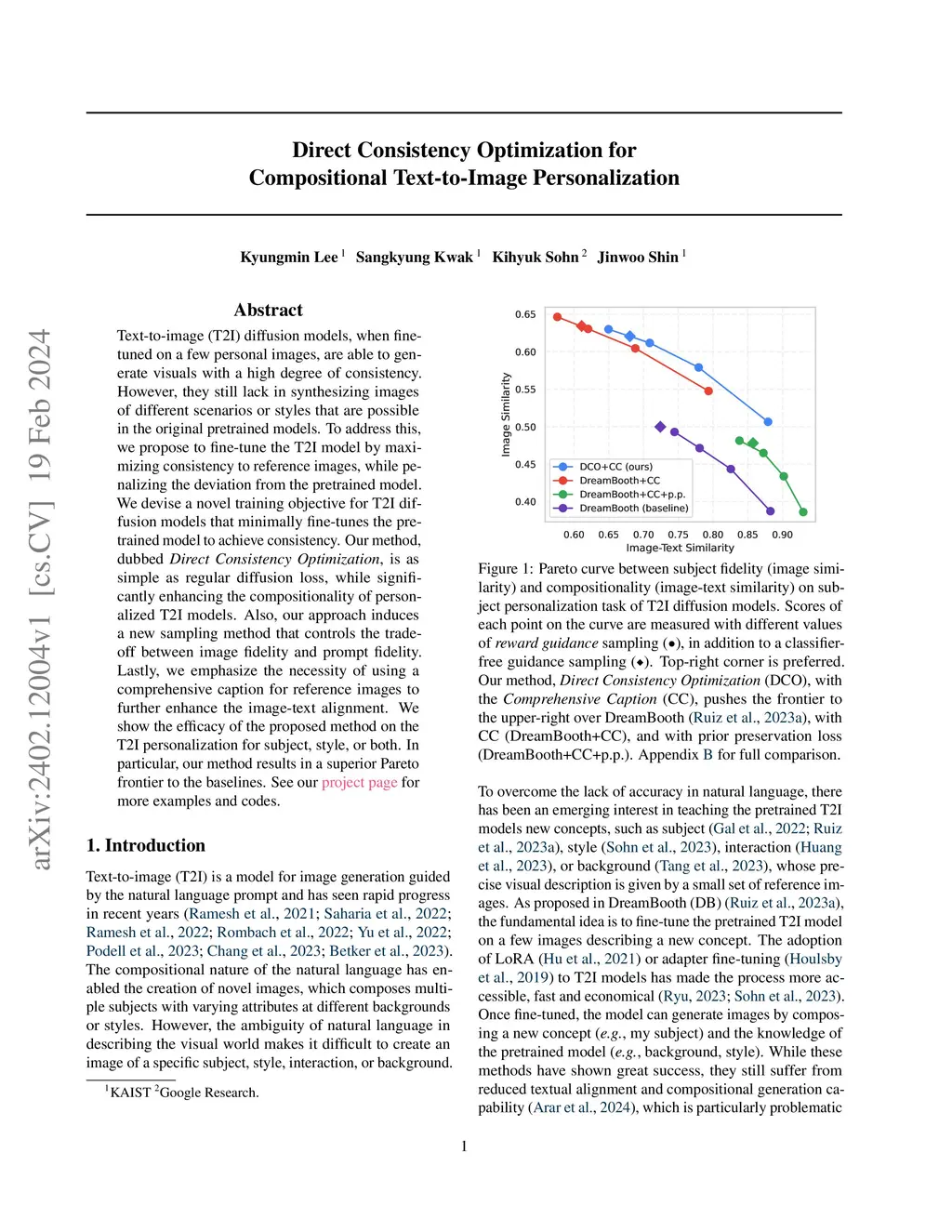 Text-to-image (T2I) diffusion models, when fine-tuned on a few personal images, are able to generate visuals with a high degree of consistency. However, they still lack in synthesizing images of different scenarios or styles that are possible in the original pretrained models. To address this, we propose to fine-tune the T2I model by maximizing consistency to reference images, while penalizing the deviation from the pretrained model. We devise a novel training objective for T2I diffusion models that minimally fine-tunes the pretrained model to achieve consistency. Our method, dubbed \emph{Direct Consistency Optimization}, is as simple as regular diffusion loss, while significantly enhancing the compositionality of personalized T2I models. Also, our approach induces a new sampling method that controls the tradeoff between image fidelity and prompt fidelity. Lastly, we emphasize the necessity of using a comprehensive caption for reference images to further enhance the image-text alignment. We show the efficacy of the proposed method on the T2I personalization for subject, style, or both. In particular, our method results in a superior Pareto frontier to the baselines. Generated examples and codes are in our project page( https://dco-t2i.github.io/).