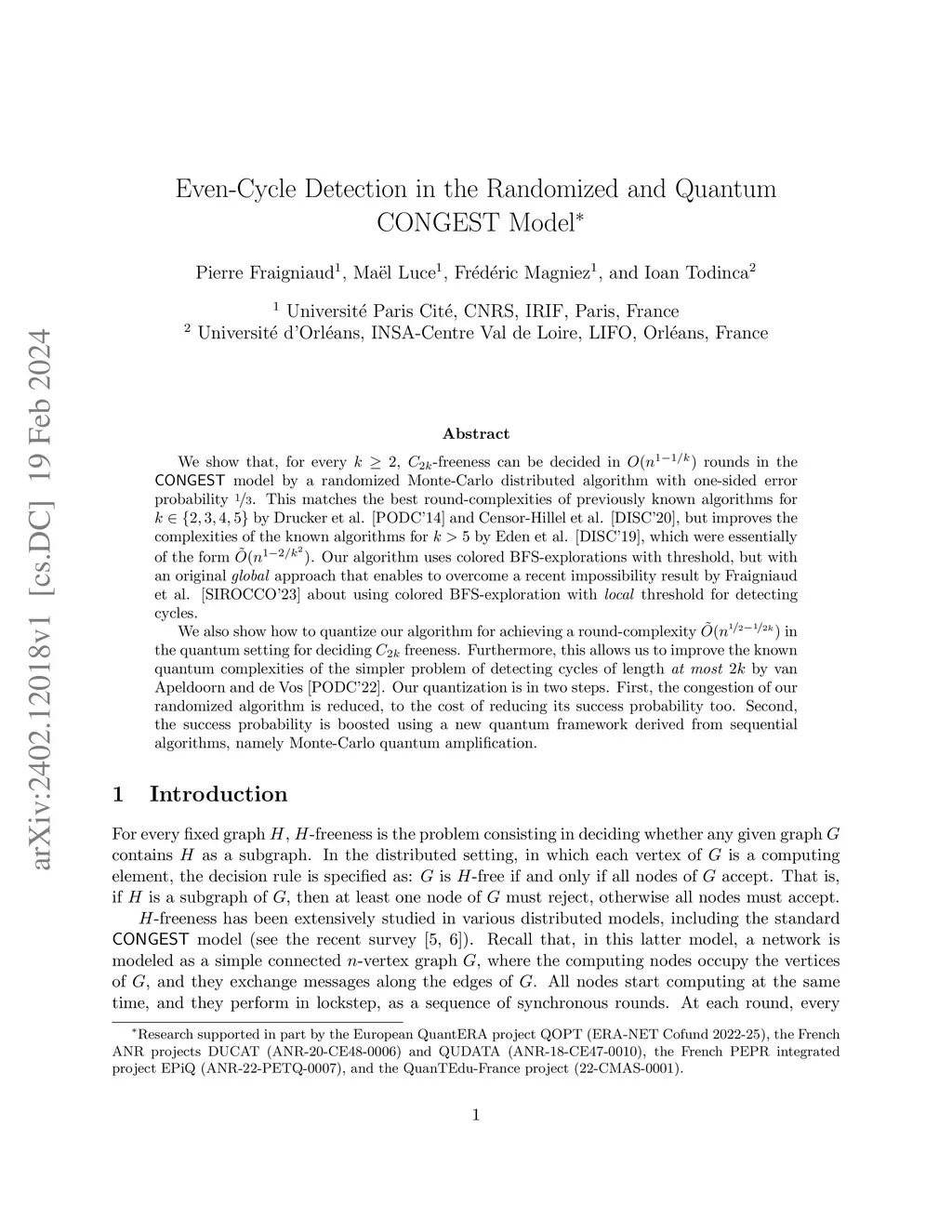 We show that, for every , -freeness can be decided in rounds in the \CONGEST{} model by a randomized Monte-Carlo distributed algorithm with one-sided error probability . This matches the best round-complexities of previously known algorithms for by Drucker et al. [PODC'14] and Censor-Hillel et al. [DISC'20], but improves the complexities of the known algorithms for by Eden et al. [DISC'19], which were essentially of the form . Our algorithm uses colored BFS-explorations with threshold, but with an original \emph{global} approach that enables to overcome a recent impossibility result by Fraigniaud et al. [SIROCCO'23] about using colored BFS-exploration with \emph{local} threshold for detecting cycles. We also show how to quantize our algorithm for achieving a round-complexity in the quantum setting for deciding freeness. Furthermore, this allows us to improve the known quantum complexities of the simpler problem of detecting cycles of length \emph{at most}~ by van Apeldoorn and de Vos [PODC'22]. Our quantization is in two steps. First, the congestion of our randomized algorithm is reduced, to the cost of reducing its success probability too. Second, the success probability is boosted using a new quantum framework derived from sequential algorithms, namely Monte-Carlo quantum amplification.