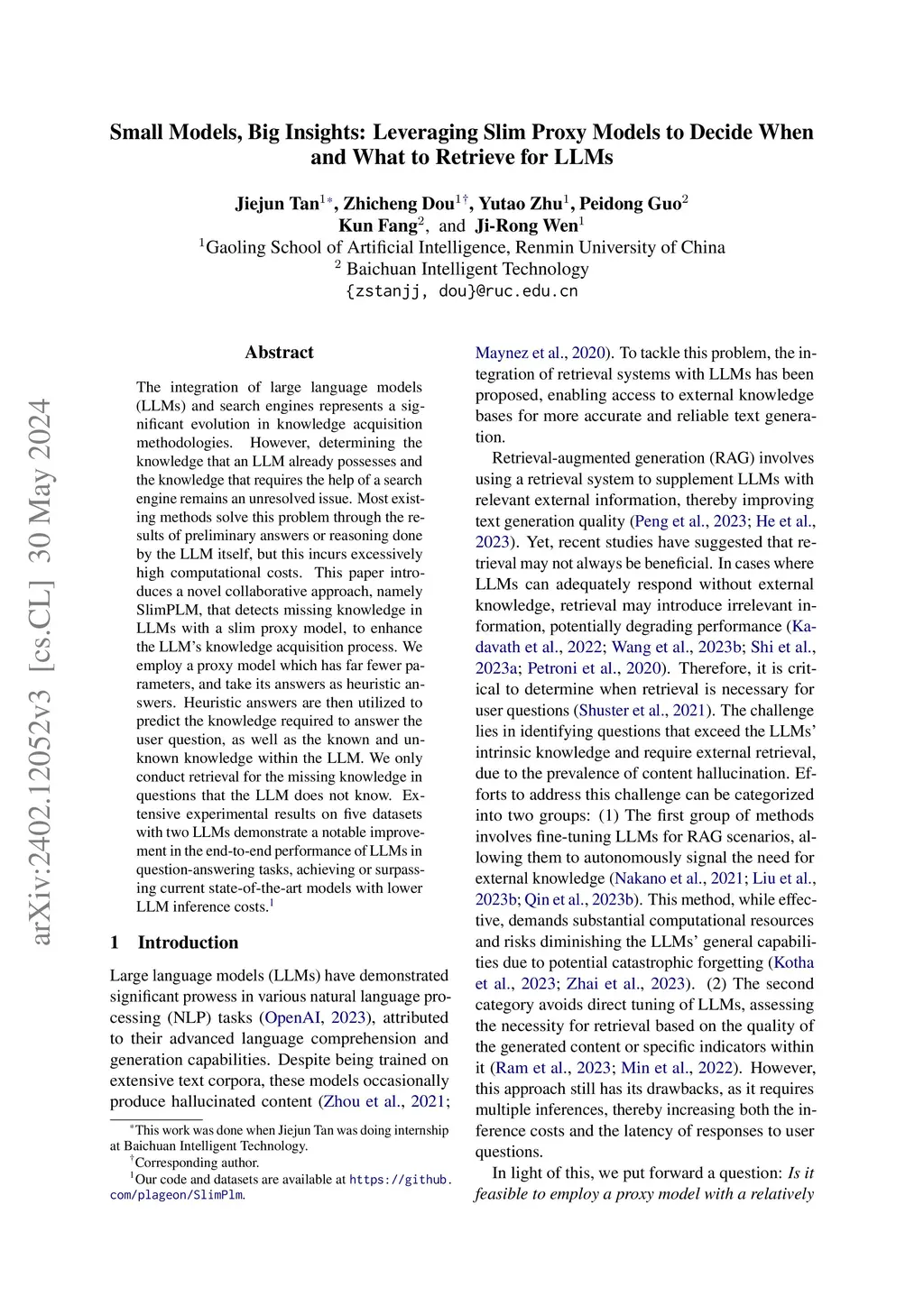 The integration of large language models (LLMs) and search engines represents a significant evolution in knowledge acquisition methodologies. However, determining the knowledge that an LLM already possesses and the knowledge that requires the help of a search engine remains an unresolved issue. Most existing methods solve this problem through the results of preliminary answers or reasoning done by the LLM itself, but this incurs excessively high computational costs. This paper introduces a novel collaborative approach, namely SlimPLM, that detects missing knowledge in LLMs with a slim proxy model, to enhance the LLM's knowledge acquisition process. We employ a proxy model which has far fewer parameters, and take its answers as heuristic answers. Heuristic answers are then utilized to predict the knowledge required to answer the user question, as well as the known and unknown knowledge within the LLM. We only conduct retrieval for the missing knowledge in questions that the LLM does not know. Extensive experimental results on five datasets with two LLMs demonstrate a notable improvement in the end-to-end performance of LLMs in question-answering tasks, achieving or surpassing current state-of-the-art models with lower LLM inference costs.