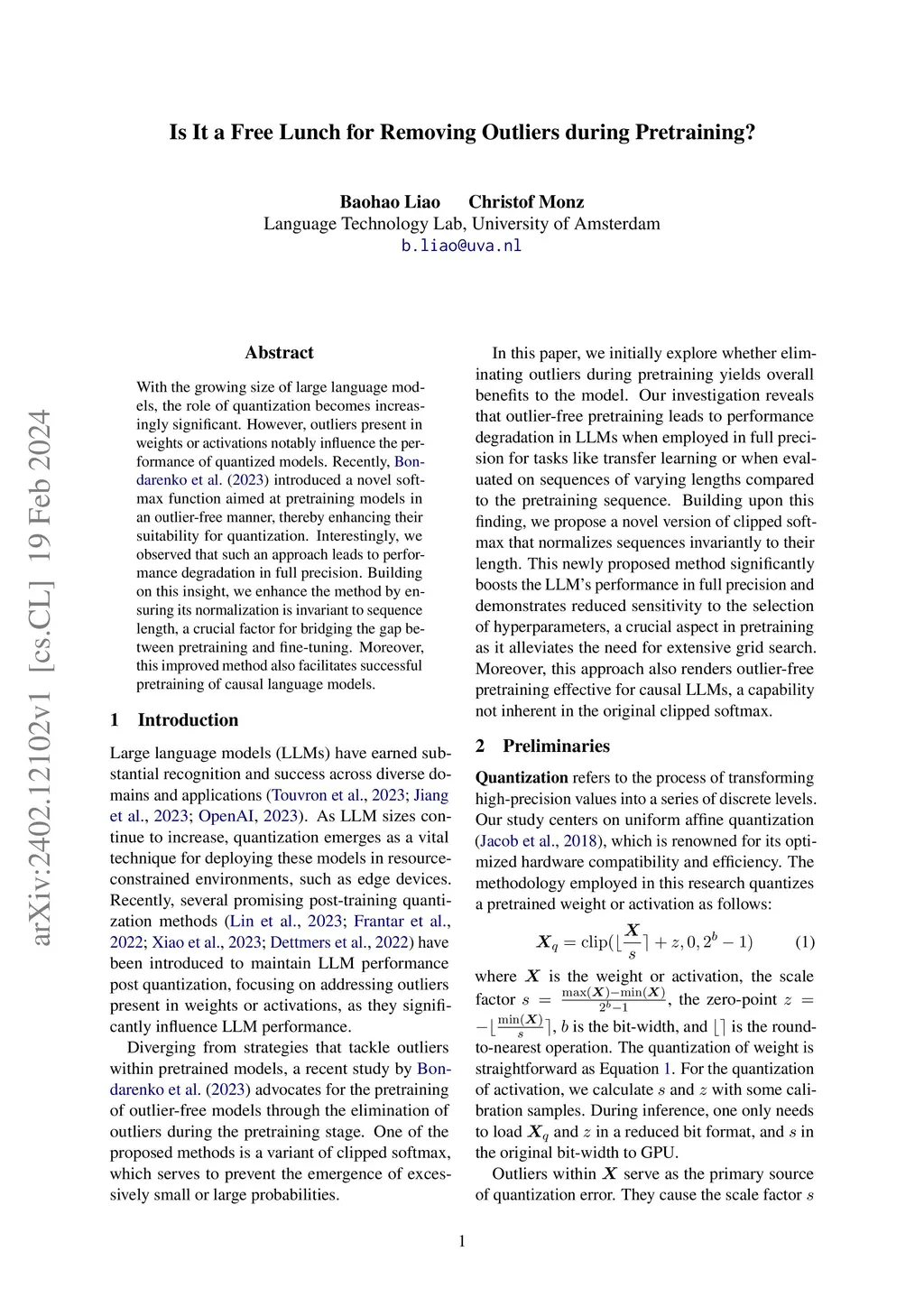 With the growing size of large language models, the role of quantization becomes increasingly significant. However, outliers present in weights or activations notably influence the performance of quantized models. Recently, \citet{qtransformer} introduced a novel softmax function aimed at pretraining models in an outlier-free manner, thereby enhancing their suitability for quantization. Interestingly, we observed that such an approach leads to performance degradation in full precision. Building on this insight, we enhance the method by ensuring its normalization is invariant to sequence length, a crucial factor for bridging the gap between pretraining and fine-tuning. Moreover, this improved method also facilitates successful pretraining of causal language models.