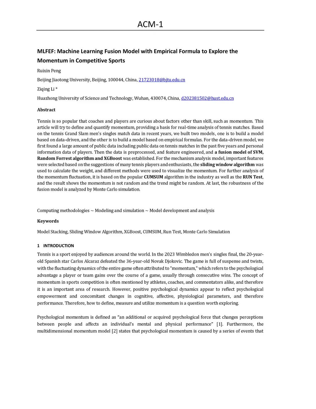 Tennis is so popular that coaches and players are curious about factors other than skill, such as momentum. This article will try to define and quantify momentum, providing a basis for real-time analysis of tennis matches. Based on the tennis Grand Slam men's singles match data in recent years, we built two models, one is to build a model based on data-driven, and the other is to build a model based on empirical formulas. For the data-driven model, we first found a large amount of public data including public data on tennis matches in the past five years and personal information data of players. Then the data is preprocessed, and feature engineered, and a fusion model of SVM, Random Forrest algorithm and XGBoost was established. For the mechanism analysis model, important features were selected based on the suggestions of many tennis players and enthusiasts, the sliding window algorithm was used to calculate the weight, and different methods were used to visualize the momentum. For further analysis of the momentum fluctuation, it is based on the popular CUMSUM algorithm in the industry as well as the RUN Test, and the result shows the momentum is not random and the trend might be random. At last, the robustness of the fusion model is analyzed by Monte Carlo simulation.