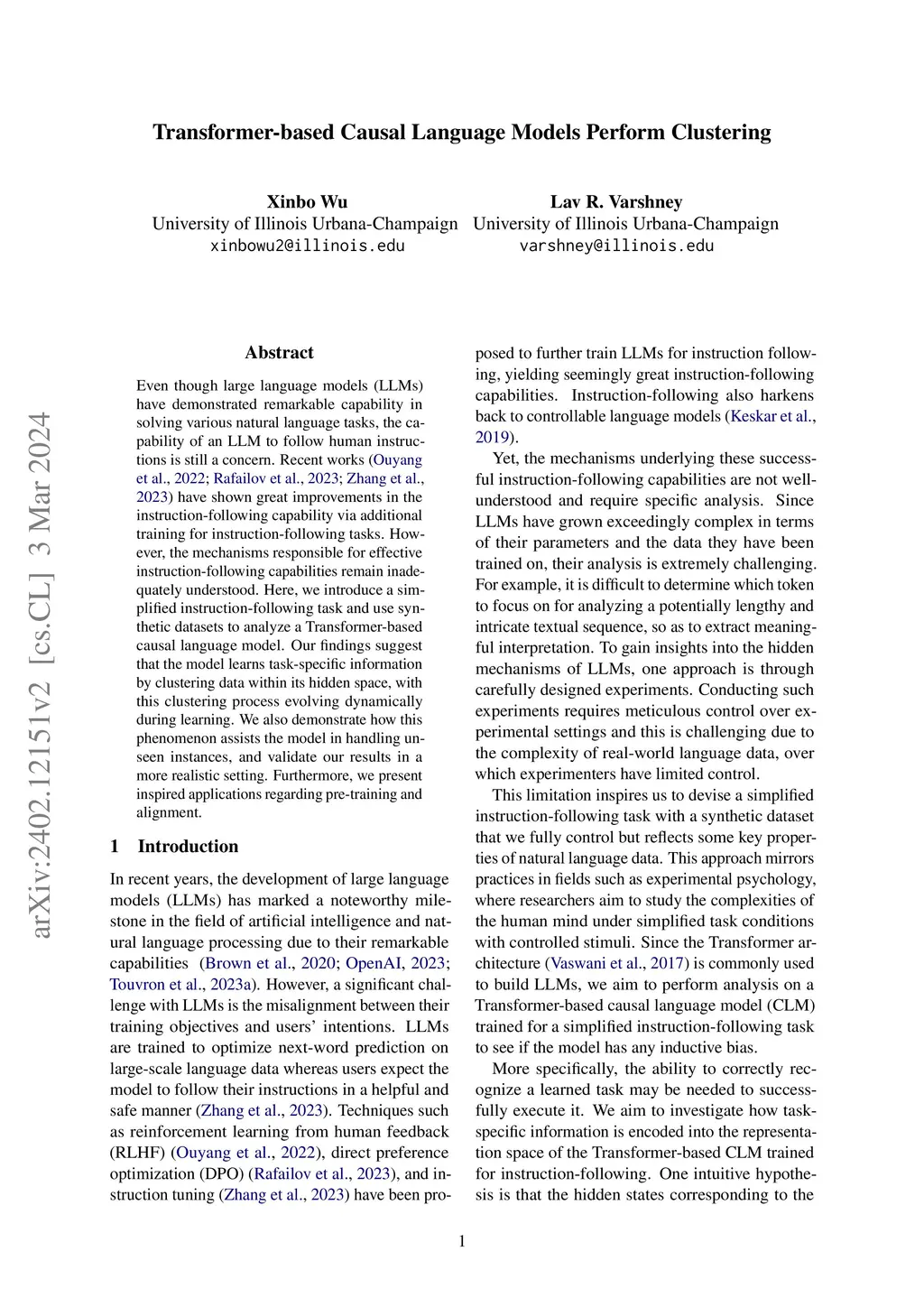 Even though large language models (LLMs) have demonstrated remarkable capability in solving various natural language tasks, the capability of an LLM to follow human instructions is still a concern. Recent works have shown great improvements in the instruction-following capability via additional training for instruction-following tasks. However, the mechanisms responsible for effective instruction-following capabilities remain inadequately understood. Here, we introduce a simplified instruction-following task and use synthetic datasets to analyze a Transformer-based causal language model. Our findings suggest that the model learns task-specific information by clustering data within its hidden space, with this clustering process evolving dynamically during learning. We also demonstrate how this phenomenon assists the model in handling unseen instances, and validate our results in a more realistic setting. Furthermore, we present inspired applications regarding pre-training and alignment.