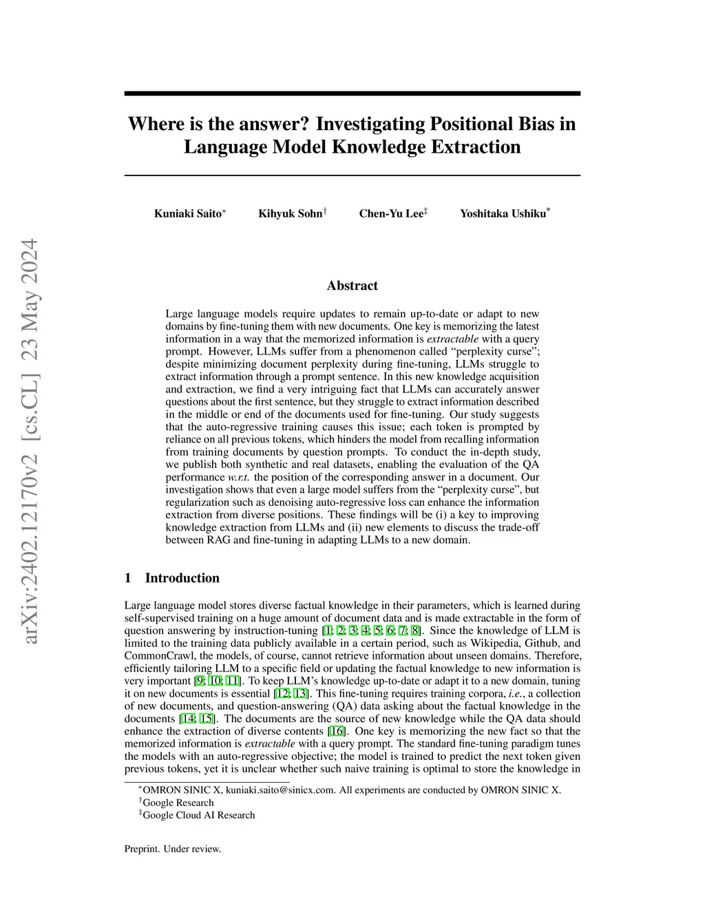 Large language models require updates to remain up-to-date or adapt to new domains by fine-tuning them with new documents. One key is memorizing the latest information in a way that the memorized information is extractable with a query prompt. However, LLMs suffer from a phenomenon called perplexity curse; despite minimizing document perplexity during fine-tuning, LLMs struggle to extract information through a prompt sentence. In this new knowledge acquisition and extraction, we find a very intriguing fact that LLMs can accurately answer questions about the first sentence, but they struggle to extract information described in the middle or end of the documents used for fine-tuning. Our study suggests that the auto-regressive training causes this issue; each token is prompted by reliance on all previous tokens, which hinders the model from recalling information from training documents by question prompts. To conduct the in-depth study, we publish both synthetic and real datasets, enabling the evaluation of the QA performance w.r.t. the position of the corresponding answer in a document. Our investigation shows that even a large model suffers from the perplexity curse, but regularization such as denoising auto-regressive loss can enhance the information extraction from diverse positions. These findings will be (i) a key to improving knowledge extraction from LLMs and (ii) new elements to discuss the trade-off between RAG and fine-tuning in adapting LLMs to a new domain.