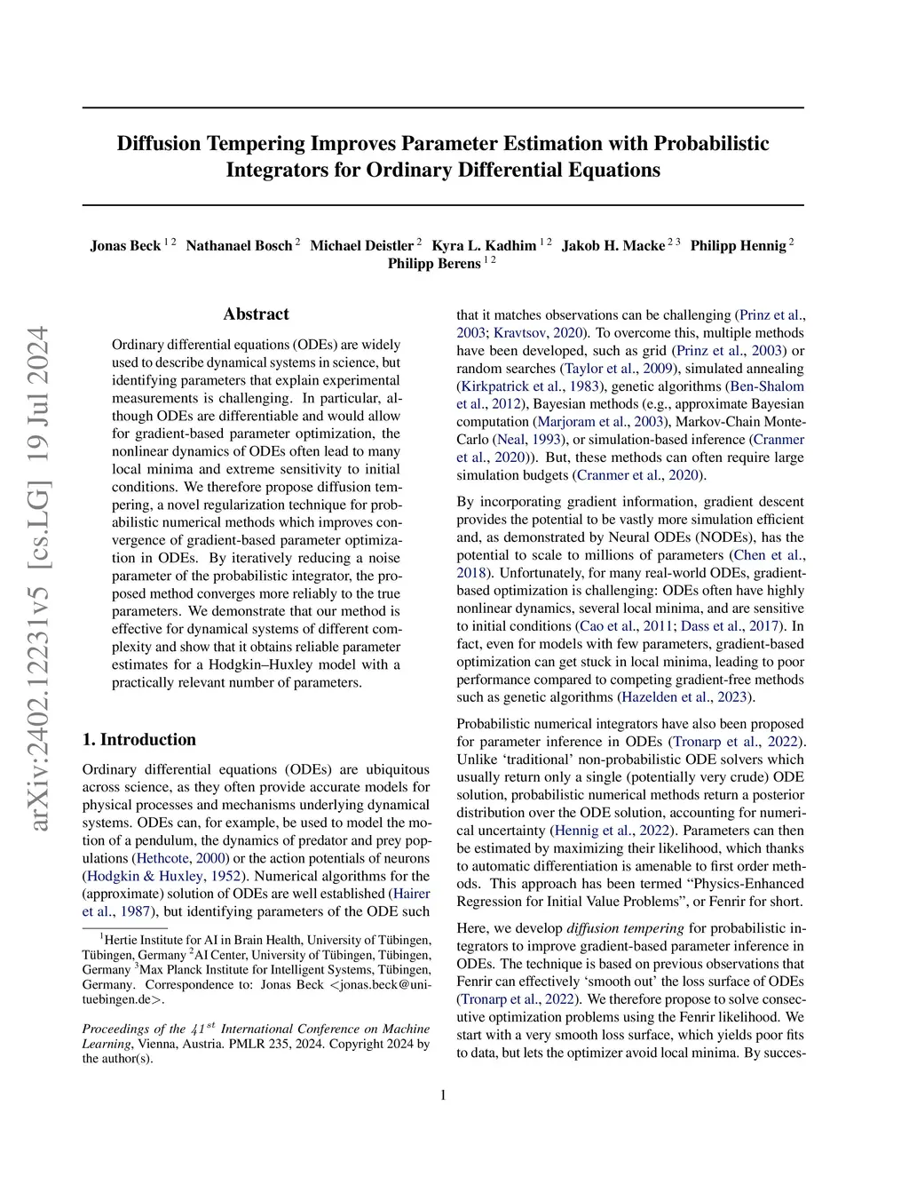 Ordinary differential equations (ODEs) are widely used to describe dynamical systems in science, but identifying parameters that explain experimental measurements is challenging. In particular, although ODEs are differentiable and would allow for gradient-based parameter optimization, the nonlinear dynamics of ODEs often lead to many local minima and extreme sensitivity to initial conditions. We therefore propose diffusion tempering, a novel regularization technique for probabilistic numerical methods which improves convergence of gradient-based parameter optimization in ODEs. By iteratively reducing a noise parameter of the probabilistic integrator, the proposed method converges more reliably to the true parameters. We demonstrate that our method is effective for dynamical systems of different complexity and show that it obtains reliable parameter estimates for a Hodgkin-Huxley model with a practically relevant number of parameters.
