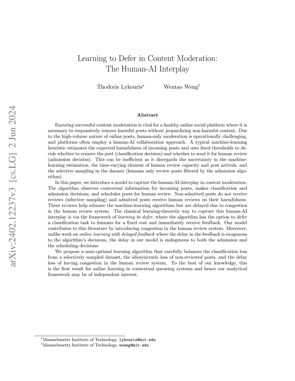 High-stakes applications rely on combining Artificial Intelligence (AI) and humans for responsive and reliable decision making. For example, content moderation in social media platforms often employs an AI-human pipeline to promptly remove policy violations without jeopardizing legitimate content. A typical heuristic estimates the risk of incoming content and uses fixed thresholds to decide whether to auto-delete the content (classification) and whether to send it for human review (admission). This approach can be inefficient as it disregards the uncertainty in AI's estimation, the time-varying element of content arrivals and human review capacity, and the selective sampling in the online dataset (humans only review content filtered by the AI).In this paper, we introduce a model to capture such an AI-human interplay. In this model, the AI observes contextual information for incoming jobs, makes classification and admission decisions, and schedules admitted jobs for human review. During these reviews, humans observe a job's true cost and may overturn an erroneous AI classification decision. These reviews also serve as new data to train the AI but are delayed due to congestion in the human review system. The objective is to minimize the costs of eventually misclassified jobs.We propose a near-optimal learning algorithm that carefully balances the classification loss from a selectively sampled dataset, the idiosyncratic loss of non-reviewed jobs, and the delay loss of having congestion in the human review system. To the best of our knowledge, this is the first result for online learning in contextual queueing systems. Moreover, numerical experiments based on online comment datasets show that our algorithm can substantially reduce the number of misclassifications compared to existing content moderation practice.