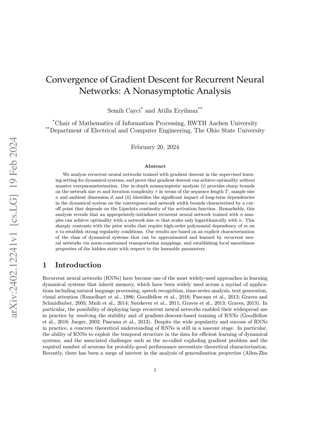 Convergence of Gradient Descent for Recurrent Neural Networks: A