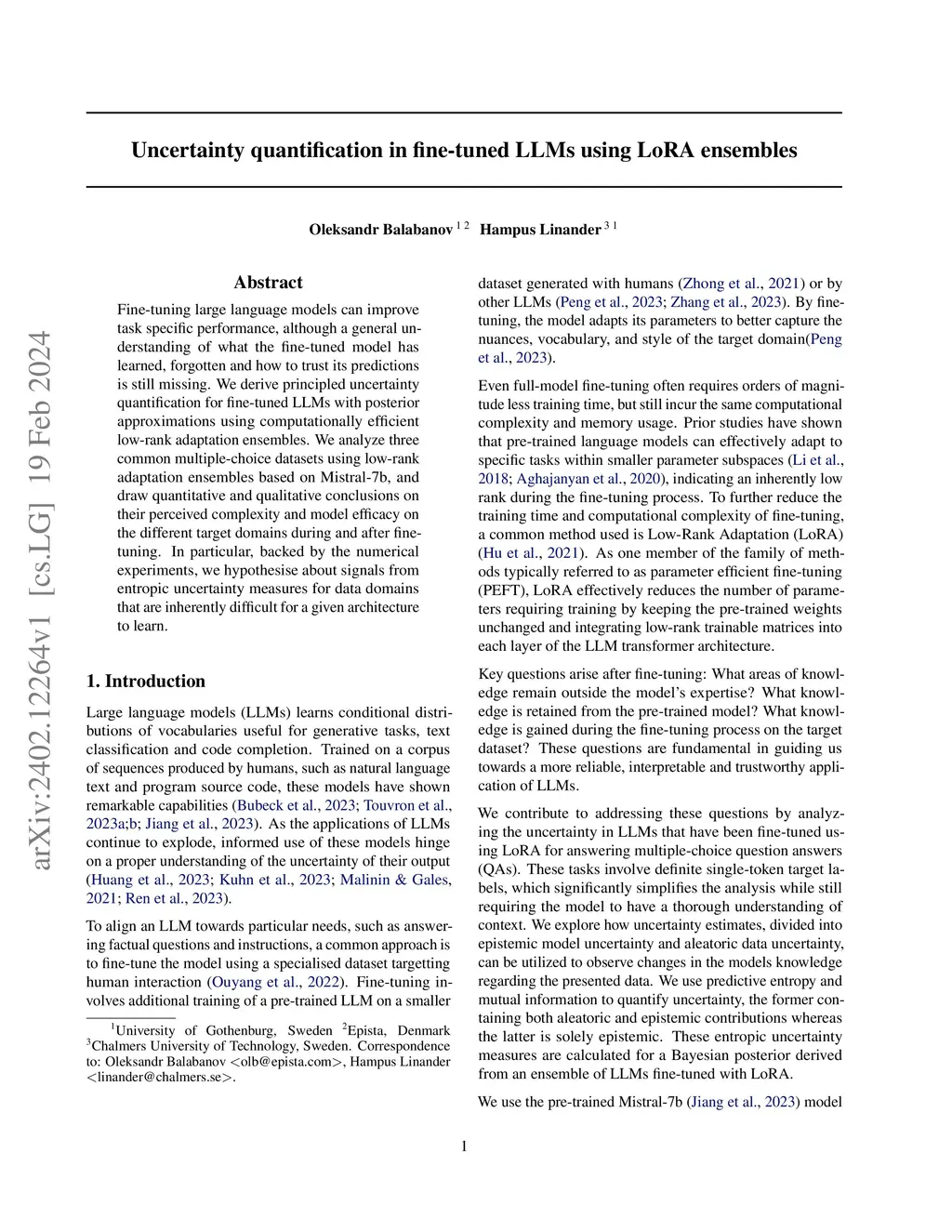 Fine-tuning large language models can improve task specific performance, although a general understanding of what the fine-tuned model has learned, forgotten and how to trust its predictions is still missing. We derive principled uncertainty quantification for fine-tuned LLMs with posterior approximations using computationally efficient low-rank adaptation ensembles. We analyze three common multiple-choice datasets using low-rank adaptation ensembles based on Mistral-7b, and draw quantitative and qualitative conclusions on their perceived complexity and balance between retained prior knowledge and domain specific adaptation during and after fine-tuning. We identify unexpected retention of acquired knowledge during fine-tuning in the overfitting regime.