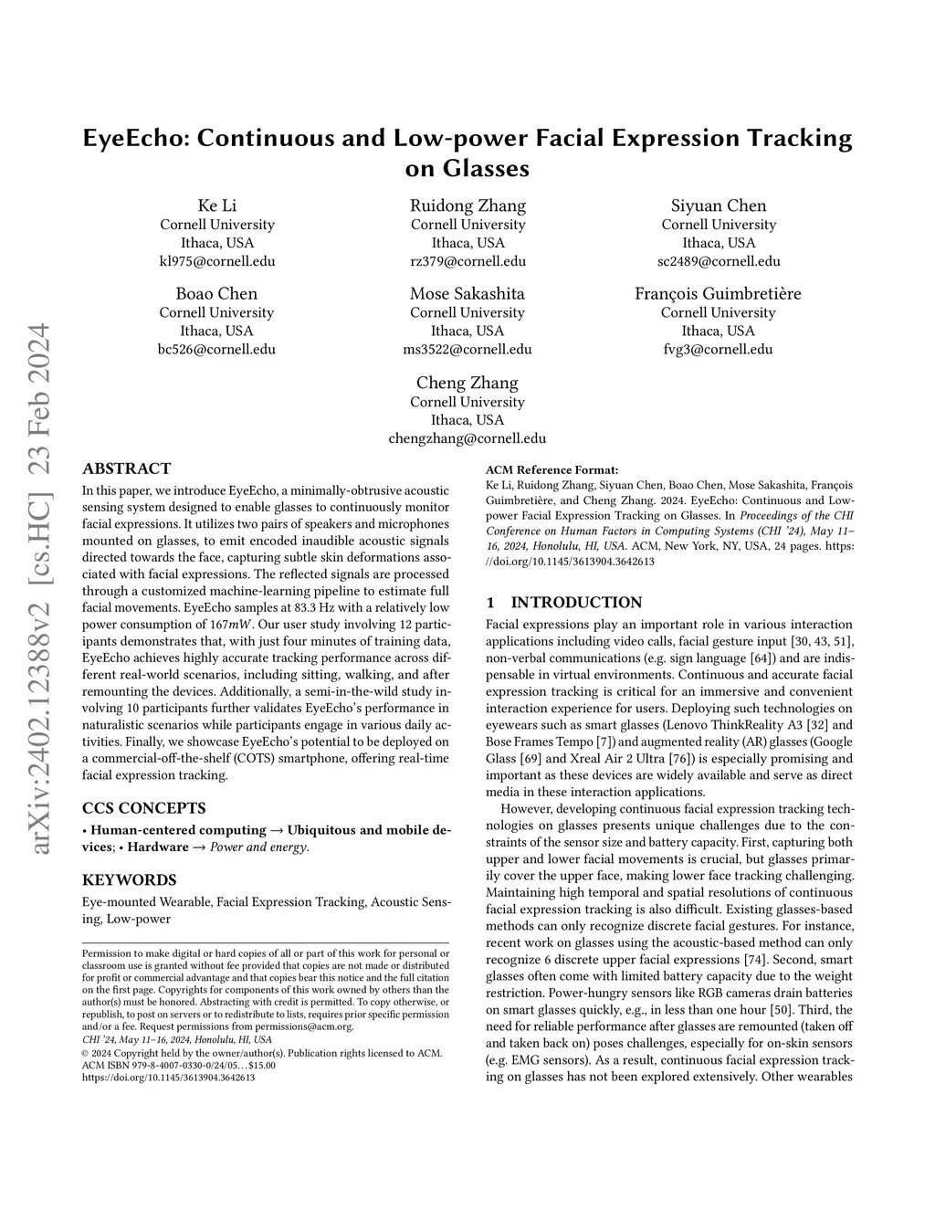 EyeEcho: Continuous and Low-power Facial Expression Tracking on Glasses