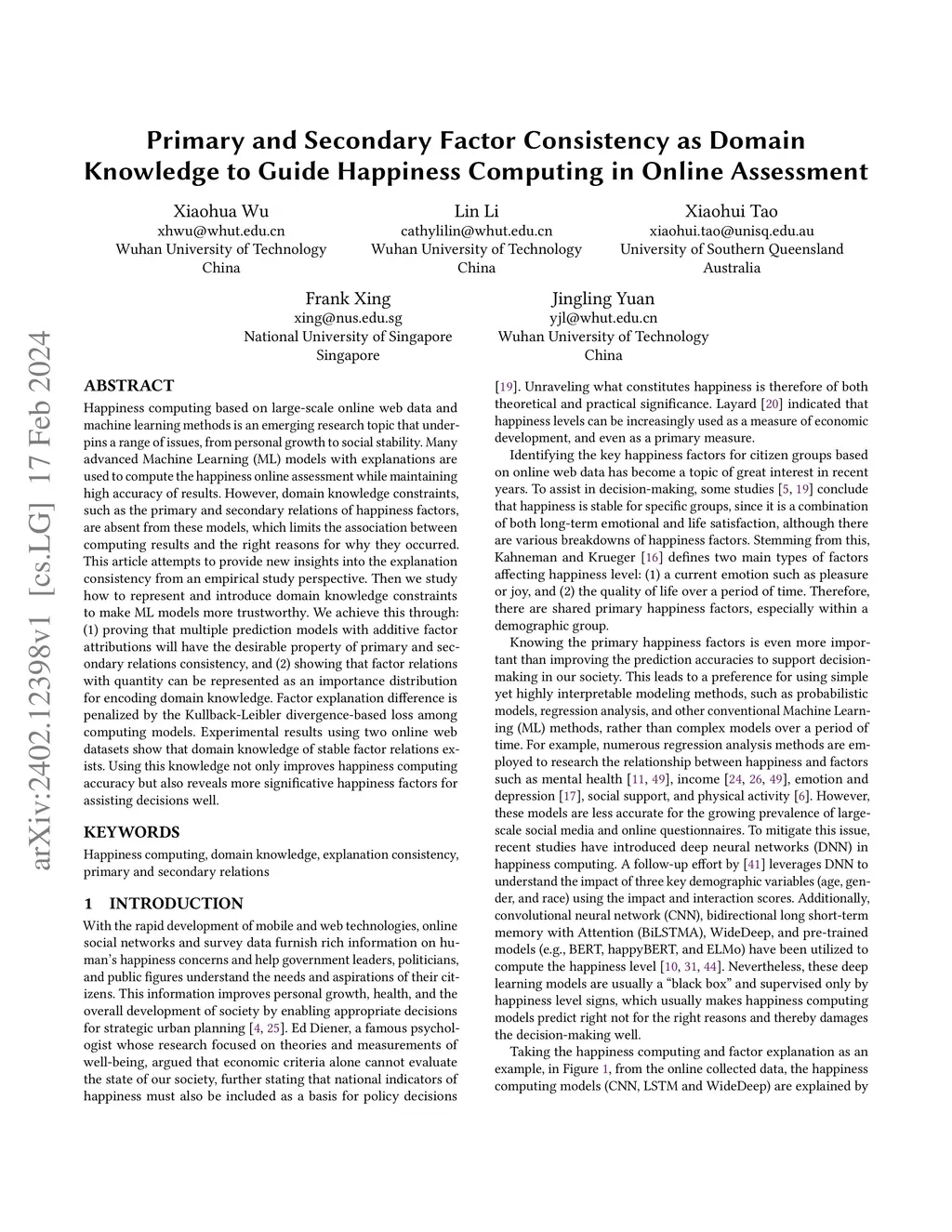 Happiness computing based on large-scale online web data and machine learning methods is an emerging research topic that underpins a range of issues, from personal growth to social stability. Many advanced Machine Learning (ML) models with explanations are used to compute the happiness online assessment while maintaining high accuracy of results. However, domain knowledge constraints, such as the primary and secondary relations of happiness factors, are absent from these models, which limits the association between computing results and the right reasons for why they occurred. This article attempts to provide new insights into the explanation consistency from an empirical study perspective. Then we study how to represent and introduce domain knowledge constraints to make ML models more trustworthy. We achieve this through: (1) proving that multiple prediction models with additive factor attributions will have the desirable property of primary and secondary relations consistency, and (2) showing that factor relations with quantity can be represented as an importance distribution for encoding domain knowledge. Factor explanation difference is penalized by the Kullback-Leibler divergence-based loss among computing models. Experimental results using two online web datasets show that domain knowledge of stable factor relations exists. Using this knowledge not only improves happiness computing accuracy but also reveals more significative happiness factors for assisting decisions well.