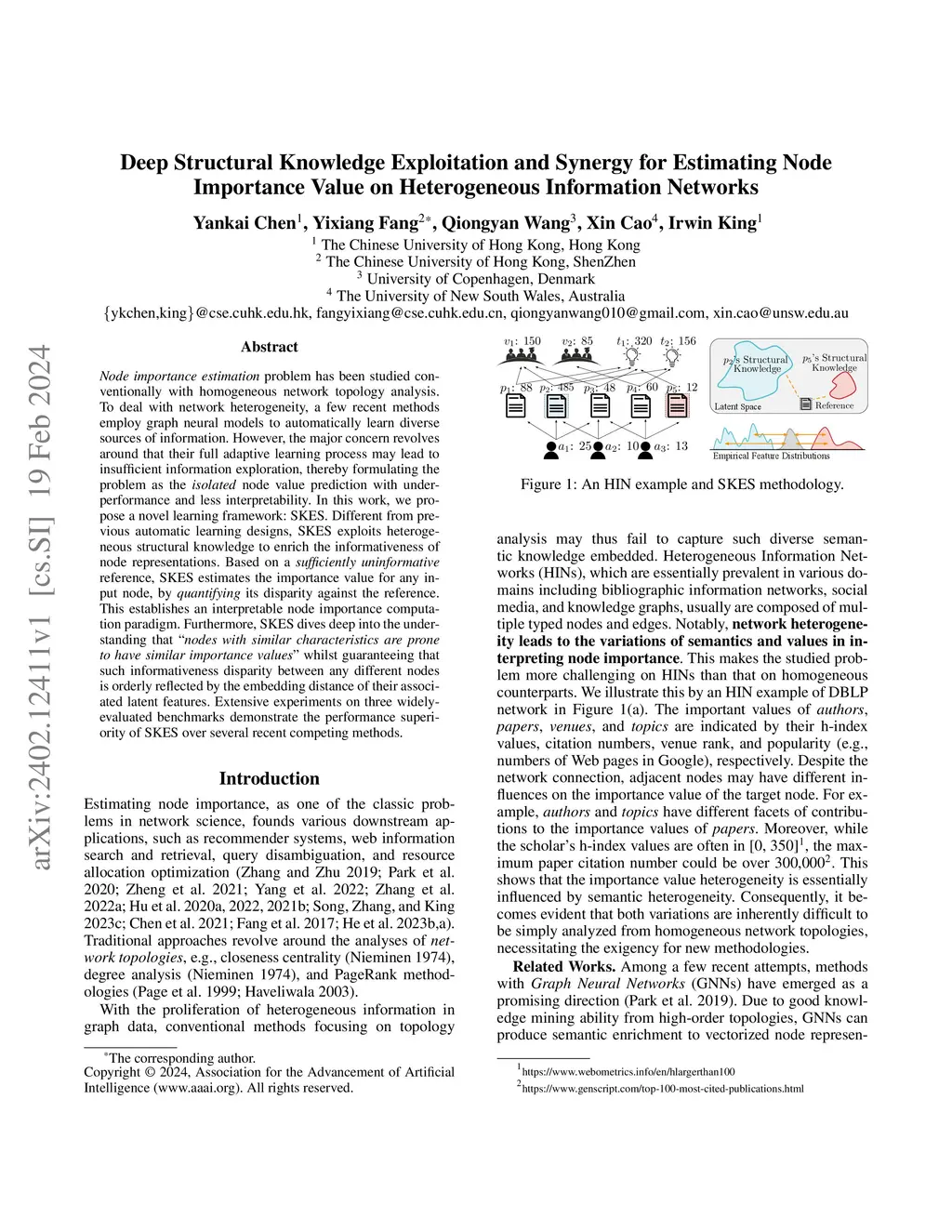 Node importance estimation problem has been studied conventionally with homogeneous network topology analysis. To deal with network heterogeneity, a few recent methods employ graph neural models to automatically learn diverse sources of information. However, the major concern revolves around that their full adaptive learning process may lead to insufficient information exploration, thereby formulating the problem as the isolated node value prediction with underperformance and less interpretability. In this work, we propose a novel learning framework: SKES. Different from previous automatic learning designs, SKES exploits heterogeneous structural knowledge to enrich the informativeness of node representations. Based on a sufficiently uninformative reference, SKES estimates the importance value for any input node, by quantifying its disparity against the reference. This establishes an interpretable node importance computation paradigm. Furthermore, SKES dives deep into the understanding that "nodes with similar characteristics are prone to have similar importance values" whilst guaranteeing that such informativeness disparity between any different nodes is orderly reflected by the embedding distance of their associated latent features. Extensive experiments on three widely-evaluated benchmarks demonstrate the performance superiority of SKES over several recent competing methods.