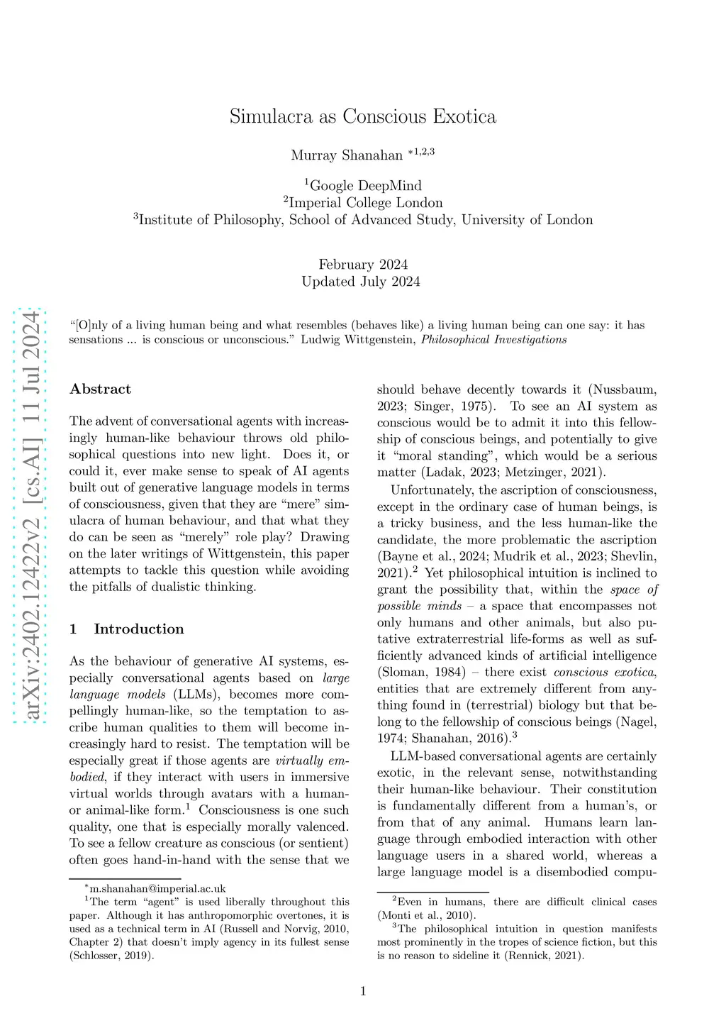 The advent of conversational agents with increasingly human-like behaviour throws old philosophical questions into new light. Does it, or could it, ever make sense to speak of AI agents built out of generative language models in terms of consciousness, given that they are "mere" simulacra of human behaviour, and that what they do can be seen as "merely" role play? Drawing on the later writings of Wittgenstein, this paper attempts to tackle this question while avoiding the pitfalls of dualistic thinking.