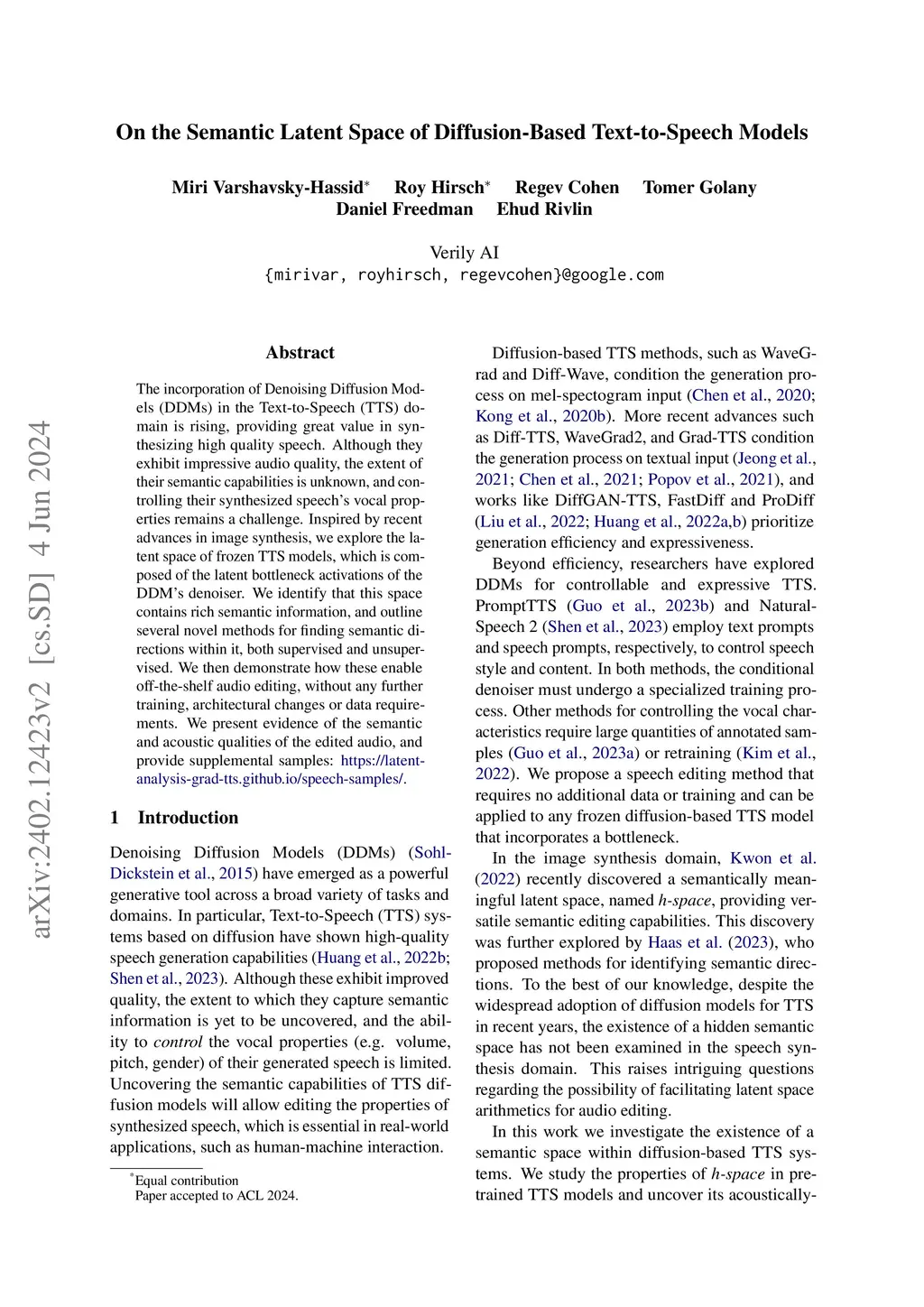The incorporation of Denoising Diffusion Models (DDMs) in the Text-to-Speech (TTS) domain is rising, providing great value in synthesizing high quality speech. Although they exhibit impressive audio quality, the extent of their semantic capabilities is unknown, and controlling their synthesized speech's vocal properties remains a challenge. Inspired by recent advances in image synthesis, we explore the latent space of frozen TTS models, which is composed of the latent bottleneck activations of the DDM's denoiser. We identify that this space contains rich semantic information, and outline several novel methods for finding semantic directions within it, both supervised and unsupervised. We then demonstrate how these enable off-the-shelf audio editing, without any further training, architectural changes or data requirements. We present evidence of the semantic and acoustic qualities of the edited audio, and provide supplemental samples: https://latent-analysis-grad-tts.github.io/speech-samples/.