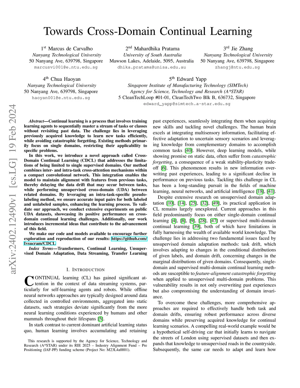 Continual learning is a process that involves training learning agents to sequentially master a stream of tasks or classes without revisiting past data. The challenge lies in leveraging previously acquired knowledge to learn new tasks efficiently, while avoiding catastrophic forgetting. Existing methods primarily focus on single domains, restricting their applicability to specific problems. In this work, we introduce a novel approach called Cross-Domain Continual Learning (CDCL) that addresses the limitations of being limited to single supervised domains. Our method combines inter- and intra-task cross-attention mechanisms within a compact convolutional network. This integration enables the model to maintain alignment with features from previous tasks, thereby delaying the data drift that may occur between tasks, while performing unsupervised cross-domain (UDA) between related domains. By leveraging an intra-task-specific pseudo-labeling method, we ensure accurate input pairs for both labeled and unlabeled samples, enhancing the learning process. To validate our approach, we conduct extensive experiments on public UDA datasets, showcasing its positive performance on cross-domain continual learning challenges. Additionally, our work introduces incremental ideas that contribute to the advancement of this field. We make our code and models available to encourage further exploration and reproduction of our results: \url{https://github.com/Ivsucram/CDCL}