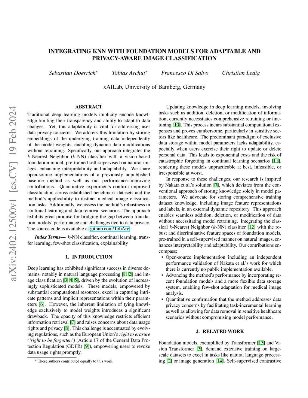 Traditional deep learning models implicity encode knowledge limiting their transparency and ability to adapt to data changes. Yet, this adaptability is vital for addressing user data privacy concerns. We address this limitation by storing embeddings of the underlying training data independently of the model weights, enabling dynamic data modifications without retraining. Specifically, our approach integrates the -Nearest Neighbor (-NN) classifier with a vision-based foundation model, pre-trained self-supervised on natural images, enhancing interpretability and adaptability. We share open-source implementations of a previously unpublished baseline method as well as our performance-improving contributions. Quantitative experiments confirm improved classification across established benchmark datasets and the method's applicability to distinct medical image classification tasks. Additionally, we assess the method's robustness in continual learning and data removal scenarios. The approach exhibits great promise for bridging the gap between foundation models' performance and challenges tied to data privacy. The source code is available at https://github.com/TobArc/privacy-aware-image-classification-with-kNN.
