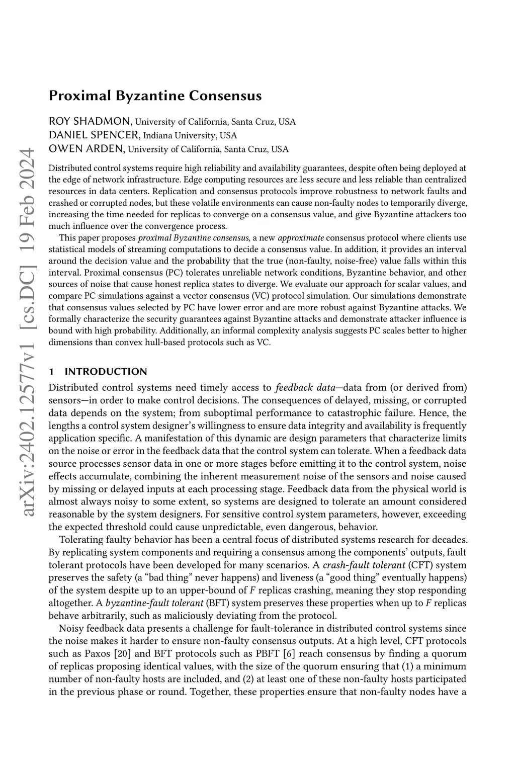 Distributed control systems require high reliability and availability guarantees despite often being deployed at the edge of network infrastructure. Edge computing resources are less secure and less reliable than centralized resources in data centers. Replication and consensus protocols improve robustness to network faults and crashed or corrupted nodes, but these volatile environments can cause non-faulty nodes to temporarily diverge, increasing the time needed for replicas to converge on a consensus value, and give Byzantine attackers too much influence over the convergence process. This paper proposes proximal Byzantine consensus, a new approximate consensus protocol where clients use statistical models of streaming computations to decide a consensus value. In addition, it provides an interval around the decision value and the probability that the true (non-faulty, noise-free) value falls within this interval. Proximal consensus (PC) tolerates unreliable network conditions, Byzantine behavior, and other sources of noise that cause honest replica states to diverge. We evaluate our approach for scalar values, and compare PC simulations against a vector consensus (VC) protocol simulation. Our simulations demonstrate that consensus values selected by PC have lower error and are more robust against Byzantine attacks. We formally characterize the security guarantees against Byzantine attacks and demonstrate attacker influence is bound with high probability. Additionally, an informal complexity analysis suggests PC scales better to higher dimensions than convex hull-based protocols such as VC.