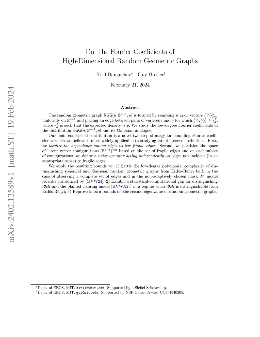 The random geometric graph is formed by sampling i.i.d. vectors uniformly on and placing an edge between pairs of vertices and for which where is such that the expected density is We study the low-degree Fourier coefficients of the distribution and its Gaussian analogue. Our main conceptual contribution is a novel two-step strategy for bounding Fourier coefficients which we believe is more widely applicable to studying latent space distributions. First, we localize the dependence among edges to few fragile edges. Second, we partition the space of latent vector configurations based on the set of fragile edges and on each subset of configurations, we define a noise operator acting independently on edges not incident (in an appropriate sense) to fragile edges. We apply the resulting bounds to: 1) Settle the low-degree polynomial complexity of distinguishing spherical and Gaussian random geometric graphs from Erdos-Renyi both in the case of observing a complete set of edges and in the non-adaptively chosen mask model recently introduced by [MVW24]; 2) Exhibit a statistical-computational gap for distinguishing and the planted coloring model [KVWX23] in a regime when is distinguishable from Erdos-Renyi; 3) Reprove known bounds on the second eigenvalue of random geometric graphs.