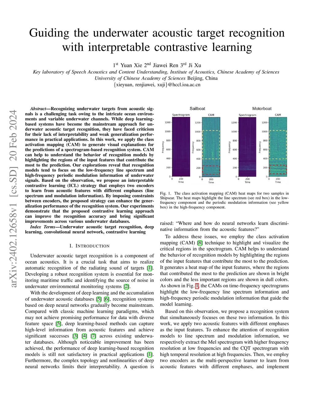 Recognizing underwater targets from acoustic signals is a challenging task owing to the intricate ocean environments and variable underwater channels. While deep learning-based systems have become the mainstream approach for underwater acoustic target recognition, they have faced criticism for their lack of interpretability and weak generalization performance in practical applications. In this work, we apply the class activation mapping (CAM) to generate visual explanations for the predictions of a spectrogram-based recognition system. CAM can help to understand the behavior of recognition models by highlighting the regions of the input features that contribute the most to the prediction. Our explorations reveal that recognition models tend to focus on the low-frequency line spectrum and high-frequency periodic modulation information of underwater signals. Based on the observation, we propose an interpretable contrastive learning (ICL) strategy that employs two encoders to learn from acoustic features with different emphases (line spectrum and modulation information). By imposing constraints between encoders, the proposed strategy can enhance the generalization performance of the recognition system. Our experiments demonstrate that the proposed contrastive learning approach can improve the recognition accuracy and bring significant improvements across various underwater databases.