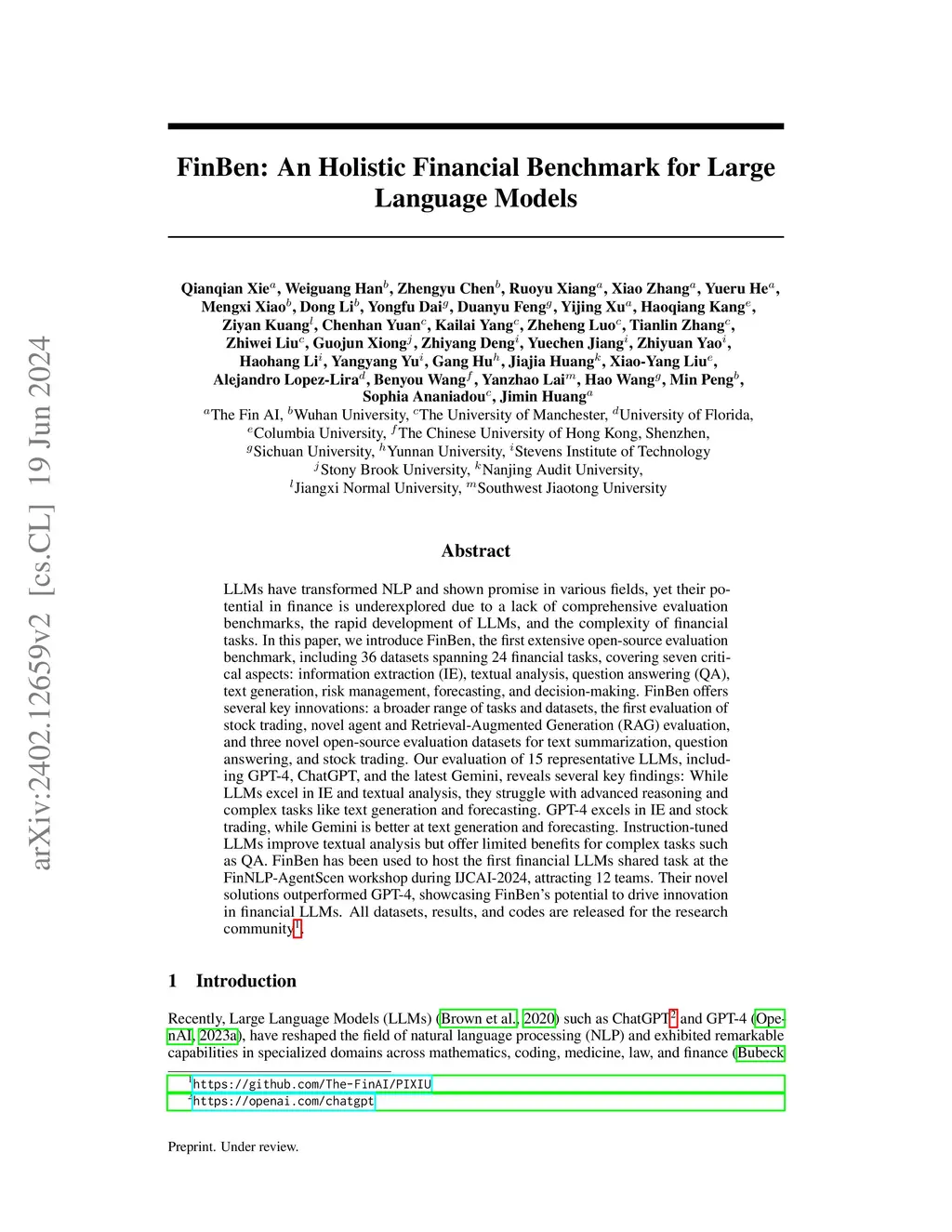 LLMs have transformed NLP and shown promise in various fields, yet their potential in finance is underexplored due to a lack of comprehensive evaluation benchmarks, the rapid development of LLMs, and the complexity of financial tasks. In this paper, we introduce FinBen, the first extensive open-source evaluation benchmark, including 36 datasets spanning 24 financial tasks, covering seven critical aspects: information extraction (IE), textual analysis, question answering (QA), text generation, risk management, forecasting, and decision-making. FinBen offers several key innovations: a broader range of tasks and datasets, the first evaluation of stock trading, novel agent and Retrieval-Augmented Generation (RAG) evaluation, and three novel open-source evaluation datasets for text summarization, question answering, and stock trading. Our evaluation of 15 representative LLMs, including GPT-4, ChatGPT, and the latest Gemini, reveals several key findings: While LLMs excel in IE and textual analysis, they struggle with advanced reasoning and complex tasks like text generation and forecasting. GPT-4 excels in IE and stock trading, while Gemini is better at text generation and forecasting. Instruction-tuned LLMs improve textual analysis but offer limited benefits for complex tasks such as QA. FinBen has been used to host the first financial LLMs shared task at the FinNLP-AgentScen workshop during IJCAI-2024, attracting 12 teams. Their novel solutions outperformed GPT-4, showcasing FinBen's potential to drive innovation in financial LLMs. All datasets, results, and codes are released for the research community: https://github.com/The-FinAI/PIXIU.