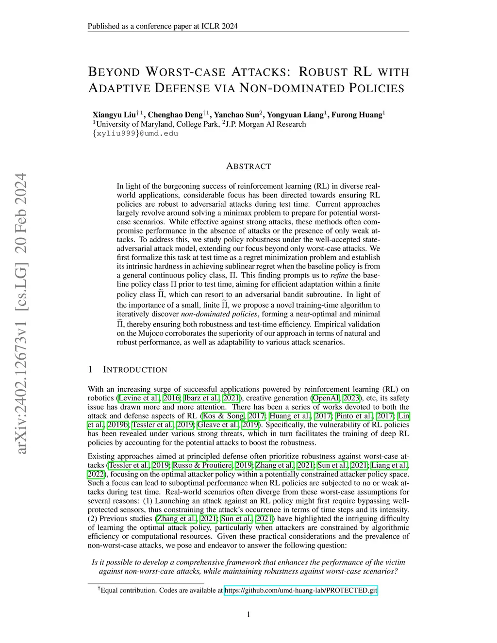 In light of the burgeoning success of reinforcement learning (RL) in diverse real-world applications, considerable focus has been directed towards ensuring RL policies are robust to adversarial attacks during test time. Current approaches largely revolve around solving a minimax problem to prepare for potential worst-case scenarios. While effective against strong attacks, these methods often compromise performance in the absence of attacks or the presence of only weak attacks. To address this, we study policy robustness under the well-accepted state-adversarial attack model, extending our focus beyond only worst-case attacks. We first formalize this task at test time as a regret minimization problem and establish its intrinsic hardness in achieving sublinear regret when the baseline policy is from a general continuous policy class, . This finding prompts us to \textit{refine} the baseline policy class prior to test time, aiming for efficient adaptation within a finite policy class , which can resort to an adversarial bandit subroutine. In light of the importance of a small, finite , we propose a novel training-time algorithm to iteratively discover \textit{non-dominated policies}, forming a near-optimal and minimal , thereby ensuring both robustness and test-time efficiency. Empirical validation on the Mujoco corroborates the superiority of our approach in terms of natural and robust performance, as well as adaptability to various attack scenarios.