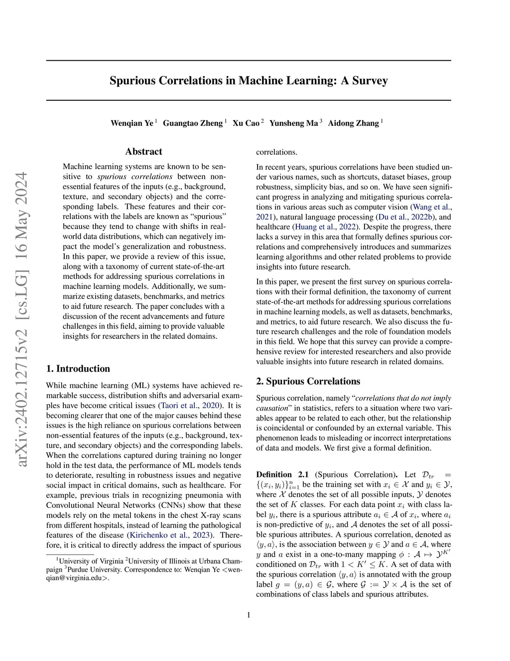 Back in the early 20th century, a horse named Hans appeared to perform arithmetic and other intellectual tasks during exhibitions in Germany, while it actually relied solely on involuntary cues in the body language from the human trainer. Modern machine learning models are no different. These models are known to be sensitive to spurious correlations between non-essential features of the inputs (e.g., background, texture, and secondary objects) and the corresponding labels. Such features and their correlations with the labels are known as "spurious" because they tend to change with shifts in real-world data distributions, which can negatively impact the model's generalization and robustness. In this paper, we provide a comprehensive survey of this emerging issue, along with a fine-grained taxonomy of existing state-of-the-art methods for addressing spurious correlations in machine learning models. Additionally, we summarize existing datasets, benchmarks, and metrics to facilitate future research. The paper concludes with a discussion of the broader impacts, the recent advancements, and future challenges in the era of generative AI, aiming to provide valuable insights for researchers in the related domains of the machine learning community.