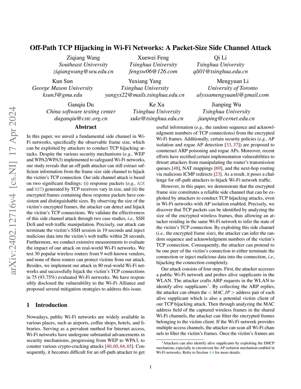 In this paper, we unveil a fundamental side channel in Wi-Fi networks, specifically the observable frame size, which can be exploited by attackers to conduct TCP hijacking attacks. Despite the various security mechanisms (e.g., WEP and WPA2/WPA3) implemented to safeguard Wi-Fi networks, our study reveals that an off path attacker can still extract sufficient information from the frame size side channel to hijack the victim's TCP connection. Our side channel attack is based on two significant findings: (i) response packets (e.g., ACK and RST) generated by TCP receivers vary in size, and (ii) the encrypted frames containing these response packets have consistent and distinguishable sizes. By observing the size of the victim's encrypted frames, the attacker can detect and hijack the victim's TCP connections. We validate the effectiveness of this side channel attack through two case studies, i.e., SSH DoS and web traffic manipulation. Furthermore, we conduct extensive measurements to evaluate the impact of our attack on real-world Wi-Fi networks. We test 30 popular wireless routers from 9 well-known vendors, and none of these routers can protect victims from our attack. Also, we implement our attack in 80 real-world Wi-Fi networks and successfully hijack the victim's TCP connections in 69 (86%) evaluated Wi-Fi networks. We have responsibly disclosed the vulnerability to the Wi-Fi Alliance and proposed several mitigation strategies to address this issue.