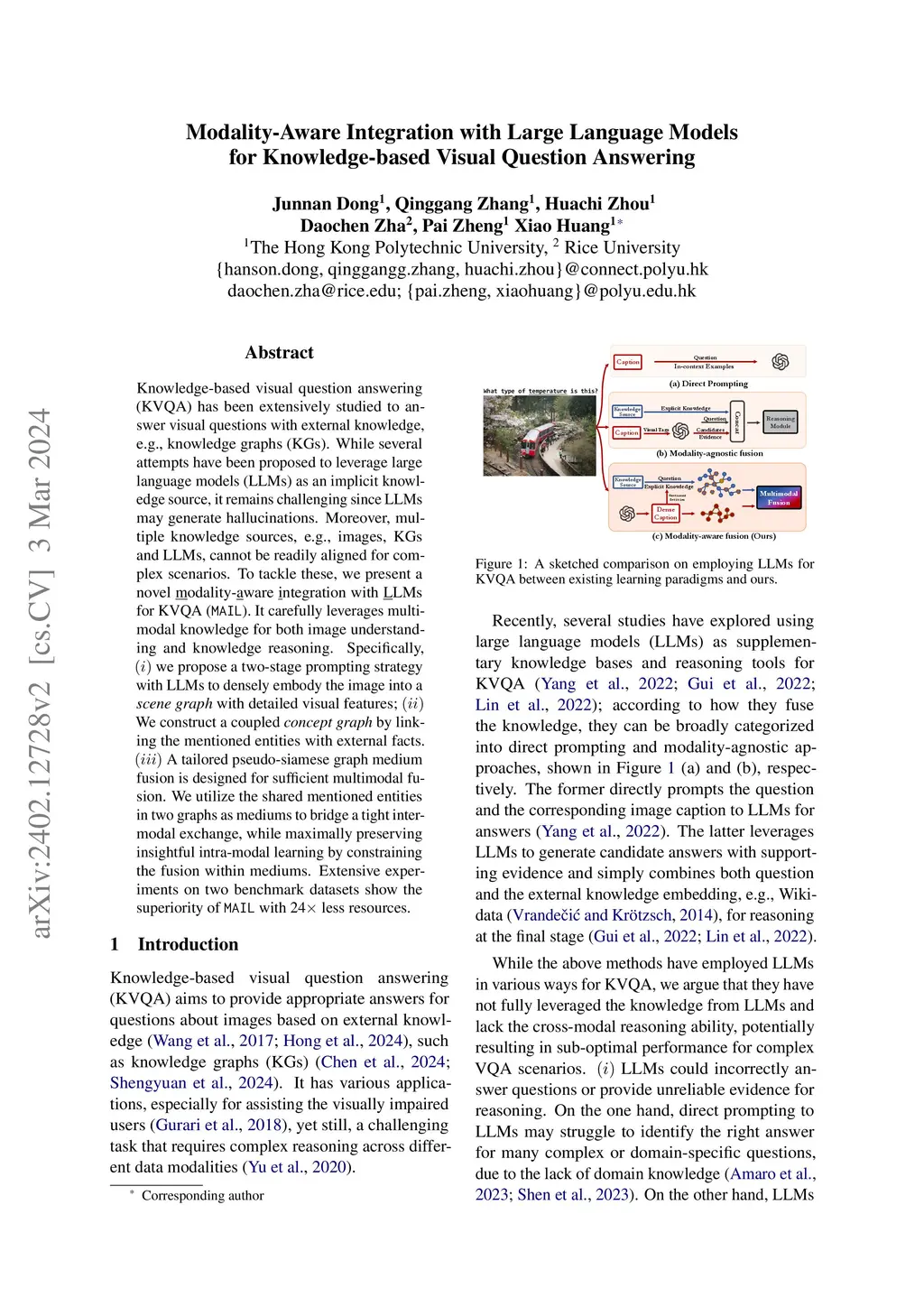 Knowledge-based visual question answering (KVQA) has been extensively studied to answer visual questions with external knowledge, e.g., knowledge graphs (KGs). While several attempts have been proposed to leverage large language models (LLMs) as an implicit knowledge source, it remains challenging since LLMs may generate hallucinations. Moreover, multiple knowledge sources, e.g., images, KGs and LLMs, cannot be readily aligned for complex scenarios. To tackle these, we present a novel modality-aware integration with LLMs for KVQA (MAIL). It carefully leverages multimodal knowledge for both image understanding and knowledge reasoning. Specifically, (i) we propose a two-stage prompting strategy with LLMs to densely embody the image into a scene graph with detailed visual features; (ii) We construct a coupled concept graph by linking the mentioned entities with external facts. (iii) A tailored pseudo-siamese graph medium fusion is designed for sufficient multimodal fusion. We utilize the shared mentioned entities in two graphs as mediums to bridge a tight inter-modal exchange, while maximally preserving insightful intra-modal learning by constraining the fusion within mediums. Extensive experiments on two benchmark datasets show the superiority of MAIL with 24x less resources.