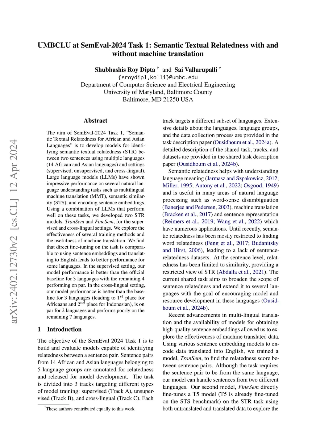 UMBCLU at SemEval-2024 Task 1A and 1C: Semantic Textual Relatedness with