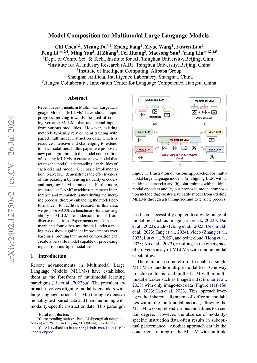 Recent developments in Multimodal Large Language Models (MLLMs) have shown rapid progress, moving towards the goal of creating versatile MLLMs that understand inputs from various modalities. However, existing methods typically rely on joint training with paired multimodal instruction data, which is resource-intensive and challenging to extend to new modalities. In this paper, we propose a new paradigm through the model composition of existing MLLMs to create a new model that retains the modal understanding capabilities of each original model. Our basic implementation, NaiveMC, demonstrates the effectiveness of this paradigm by reusing modality encoders and merging LLM parameters. Furthermore, we introduce DAMC to address parameter interference and mismatch issues during the merging process, thereby enhancing the model performance. To facilitate research in this area, we propose MCUB, a benchmark for assessing ability of MLLMs to understand inputs from diverse modalities. Experiments on this benchmark and four other multimodal understanding tasks show significant improvements over baselines, proving that model composition can create a versatile model capable of processing inputs from multiple modalities.