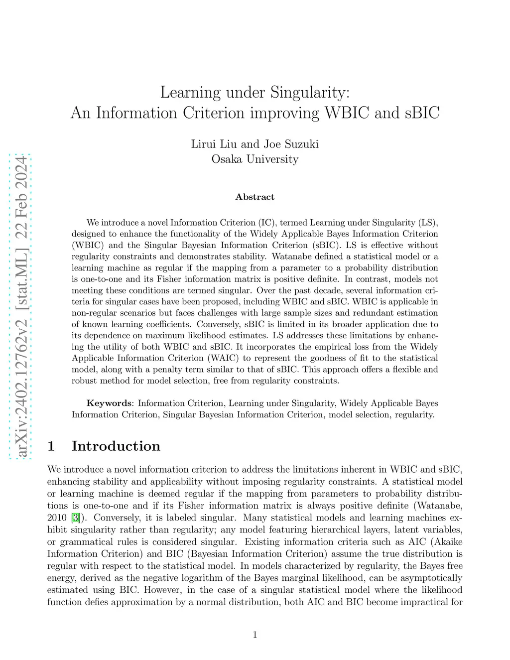 We introduce a novel Information Criterion (IC), termed Learning under Singularity (LS), designed to enhance the functionality of the Widely Applicable Bayes Information Criterion (WBIC) and the Singular Bayesian Information Criterion (sBIC). LS is effective without regularity constraints and demonstrates stability. Watanabe defined a statistical model or a learning machine as regular if the mapping from a parameter to a probability distribution is one-to-one and its Fisher information matrix is positive definite. In contrast, models not meeting these conditions are termed singular. Over the past decade, several information criteria for singular cases have been proposed, including WBIC and sBIC. WBIC is applicable in non-regular scenarios but faces challenges with large sample sizes and redundant estimation of known learning coefficients. Conversely, sBIC is limited in its broader application due to its dependence on maximum likelihood estimates. LS addresses these limitations by enhancing the utility of both WBIC and sBIC. It incorporates the empirical loss from the Widely Applicable Information Criterion (WAIC) to represent the goodness of fit to the statistical model, along with a penalty term similar to that of sBIC. This approach offers a flexible and robust method for model selection, free from regularity constraints.