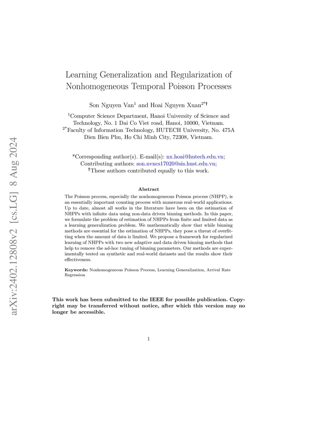 The Poisson process, especially the nonhomogeneous Poisson process (NHPP), is an essentially important counting process with numerous real-world applications. Up to date, almost all works in the literature have been on the estimation of NHPPs with infinite data using non-data driven binning methods. In this paper, we formulate the problem of estimation of NHPPs from finite and limited data as a learning generalization problem. We mathematically show that while binning methods are essential for the estimation of NHPPs, they pose a threat of overfitting when the amount of data is limited. We propose a framework for regularized learning of NHPPs with two new adaptive and data-driven binning methods that help to remove the ad-hoc tuning of binning parameters. Our methods are experimentally tested on synthetic and real-world datasets and the results show their effectiveness.