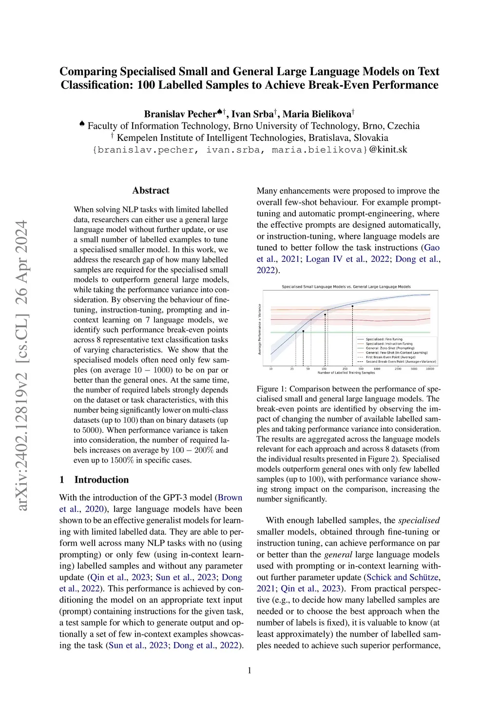 When solving NLP tasks with limited labelled data, researchers typically either use a general large language model without further update, or use a small number of labelled samples to tune a specialised smaller model. In this work, we answer an important question -- how many labelled samples are required for the specialised small models to outperform general large models, while taking the performance variance into consideration. By observing the behaviour of fine-tuning, instruction-tuning, prompting and in-context learning on 8 language models, we identify such performance break-even points across 8 representative text classification tasks of varying characteristics. We show that the specialised models often need only few samples (on average ) to be on par or better than the general ones. At the same time, the number of required labels strongly depends on the dataset or task characteristics, with fine-tuning on binary datasets requiring significantly more samples. When performance variance is taken into consideration, the number of required labels increases on average by . Finally, larger models do not consistently lead to better performance and lower variance, with 4-bit quantisation having negligible impact.