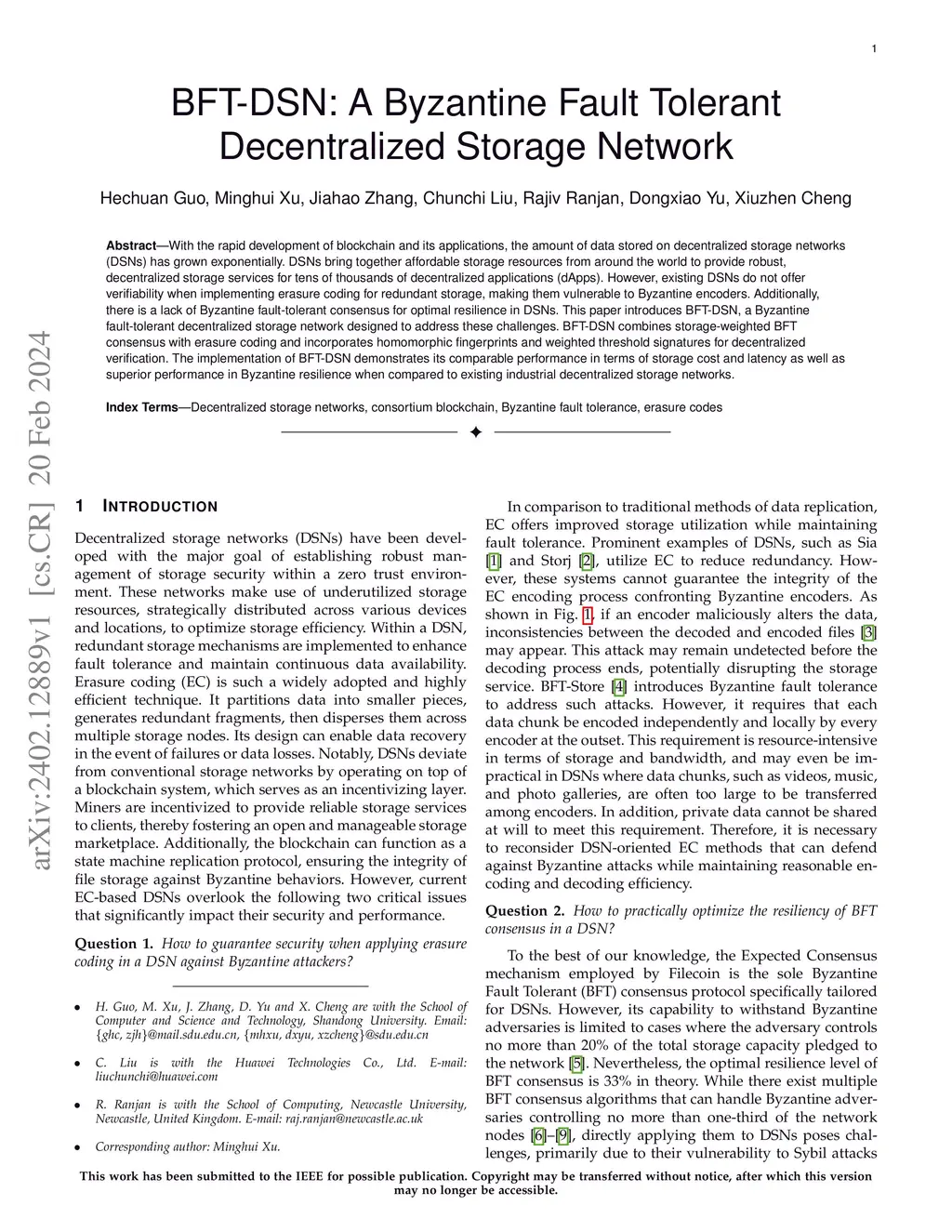 BFT-DSN: A Byzantine Fault Tolerant Decentralized Storage Network