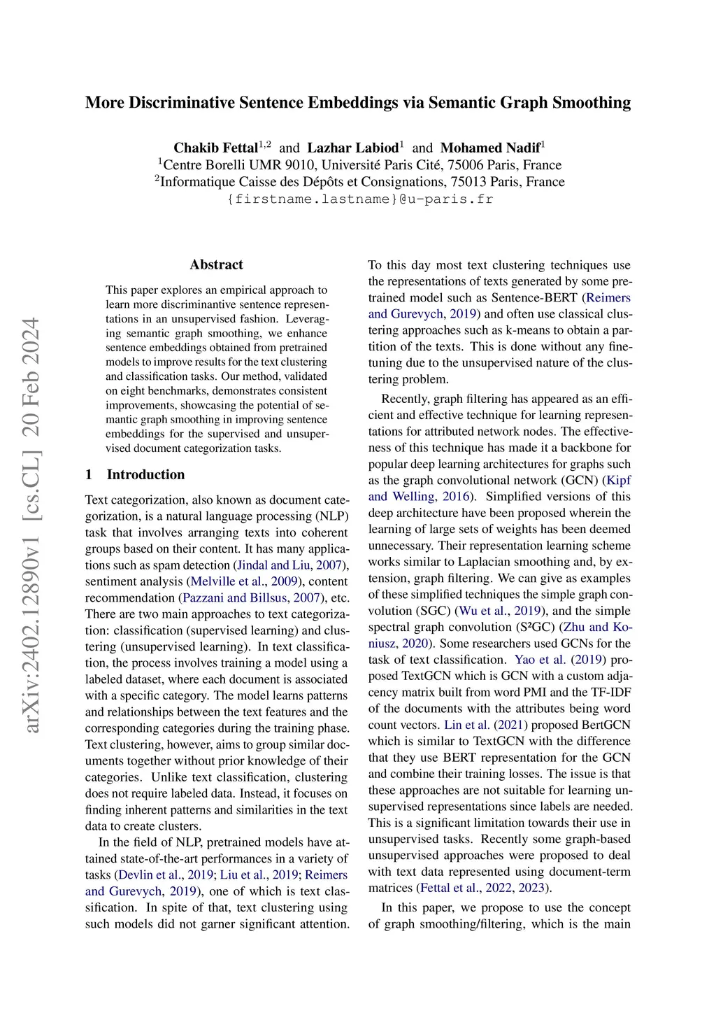 This paper explores an empirical approach to learn more discriminantive sentence representations in an unsupervised fashion. Leveraging semantic graph smoothing, we enhance sentence embeddings obtained from pretrained models to improve results for the text clustering and classification tasks. Our method, validated on eight benchmarks, demonstrates consistent improvements, showcasing the potential of semantic graph smoothing in improving sentence embeddings for the supervised and unsupervised document categorization tasks.