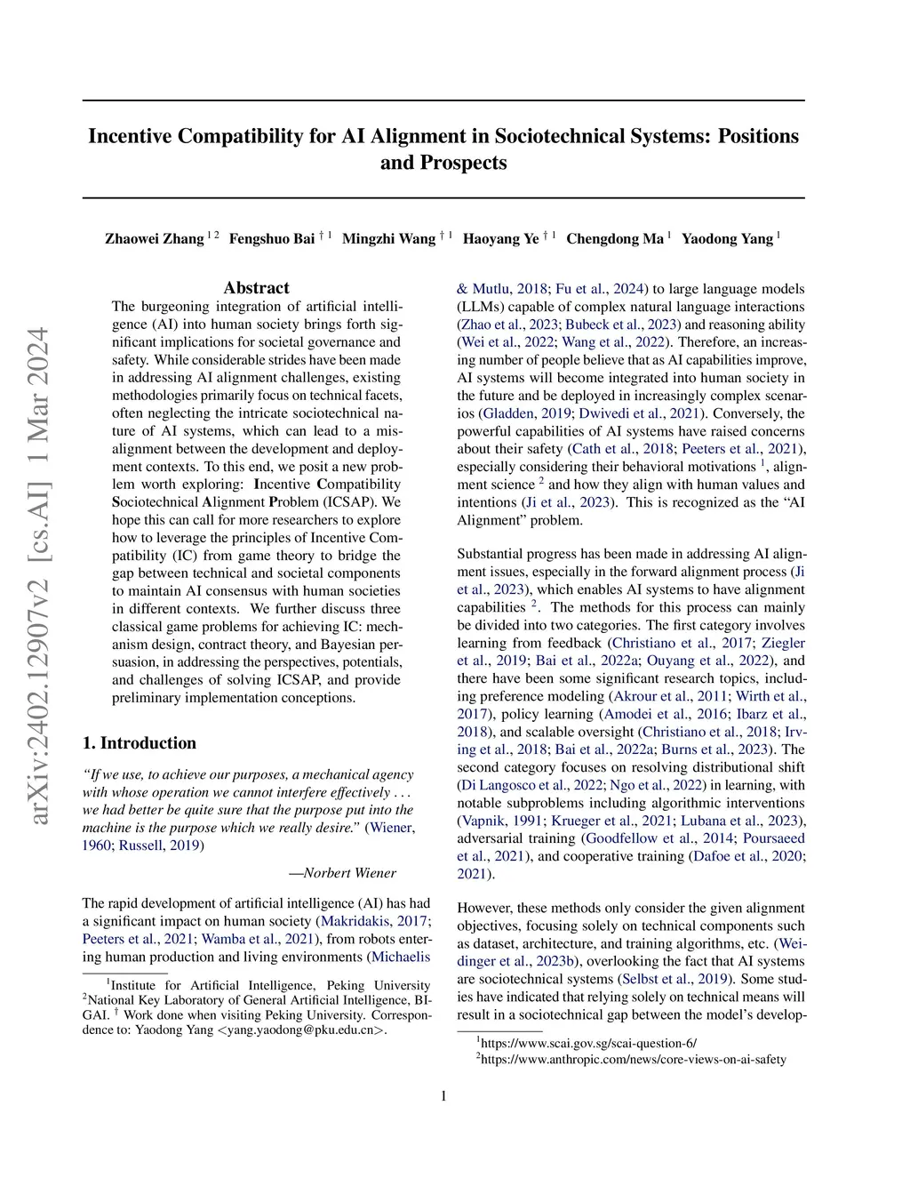 The burgeoning integration of artificial intelligence (AI) into human society brings forth significant implications for societal governance and safety. While considerable strides have been made in addressing AI alignment challenges, existing methodologies primarily focus on technical facets, often neglecting the intricate sociotechnical nature of AI systems, which can lead to a misalignment between the development and deployment contexts. To this end, we posit a new problem worth exploring: Incentive Compatibility Sociotechnical Alignment Problem (ICSAP). We hope this can call for more researchers to explore how to leverage the principles of Incentive Compatibility (IC) from game theory to bridge the gap between technical and societal components to maintain AI consensus with human societies in different contexts. We further discuss three classical game problems for achieving IC: mechanism design, contract theory, and Bayesian persuasion, in addressing the perspectives, potentials, and challenges of solving ICSAP, and provide preliminary implementation conceptions.