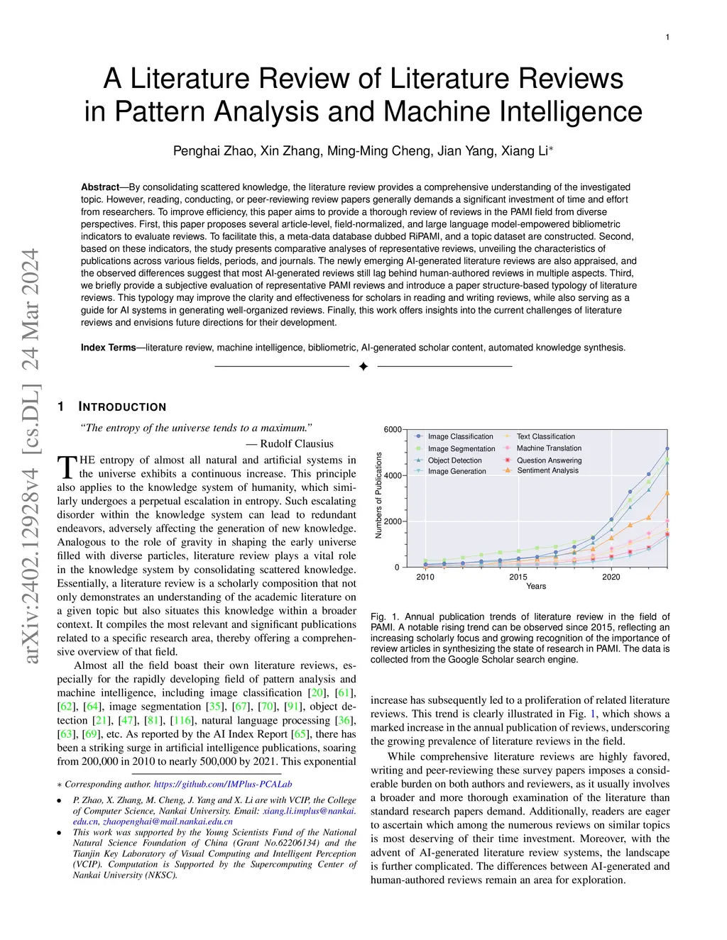 By consolidating scattered knowledge, the literature review provides a comprehensive understanding of the investigated topic. However, reading, conducting, or peer-reviewing review papers generally demands a significant investment of time and effort from researchers. To improve efficiency, this paper aims to provide a thorough review of reviews in the PAMI field from diverse perspectives. First, this paper proposes several article-level, field-normalized, and large language model-empowered bibliometric indicators to evaluate reviews. To facilitate this, a meta-data database dubbed RiPAMI, and a topic dataset are constructed. Second, based on these indicators, the study presents comparative analyses of representative reviews, unveiling the characteristics of publications across various fields, periods, and journals. The newly emerging AI-generated literature reviews are also appraised, and the observed differences suggest that most AI-generated reviews still lag behind human-authored reviews in multiple aspects. Third, we briefly provide a subjective evaluation of representative PAMI reviews and introduce a paper structure-based typology of literature reviews. This typology may improve the clarity and effectiveness for scholars in reading and writing reviews, while also serving as a guide for AI systems in generating well-organized reviews. Finally, this work offers insights into the current challenges of literature reviews and envisions future directions for their development.