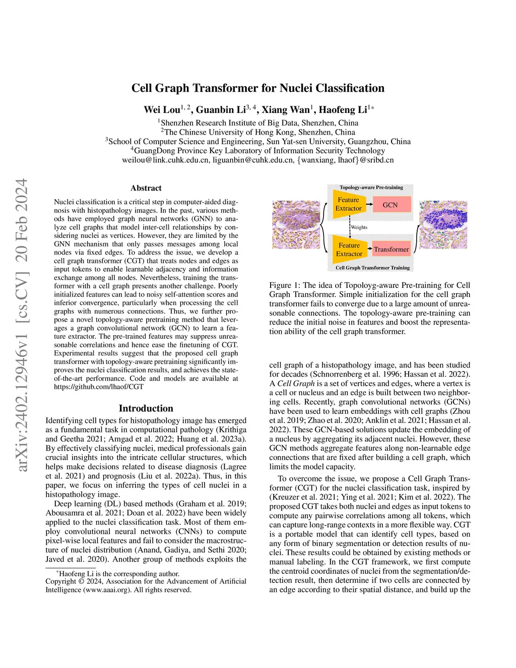 Nuclei classification is a critical step in computer-aided diagnosis with histopathology images. In the past, various methods have employed graph neural networks (GNN) to analyze cell graphs that model inter-cell relationships by considering nuclei as vertices. However, they are limited by the GNN mechanism that only passes messages among local nodes via fixed edges. To address the issue, we develop a cell graph transformer (CGT) that treats nodes and edges as input tokens to enable learnable adjacency and information exchange among all nodes. Nevertheless, training the transformer with a cell graph presents another challenge. Poorly initialized features can lead to noisy self-attention scores and inferior convergence, particularly when processing the cell graphs with numerous connections. Thus, we further propose a novel topology-aware pretraining method that leverages a graph convolutional network (GCN) to learn a feature extractor. The pre-trained features may suppress unreasonable correlations and hence ease the finetuning of CGT. Experimental results suggest that the proposed cell graph transformer with topology-aware pretraining significantly improves the nuclei classification results, and achieves the state-of-the-art performance. Code and models are available at https://github.com/lhaof/CGT