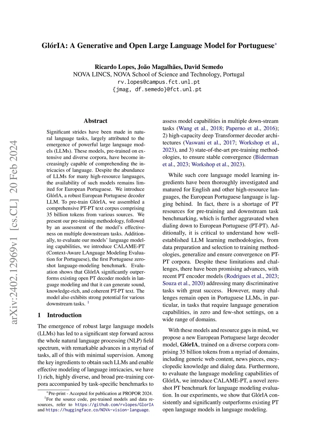 Significant strides have been made in natural language tasks, largely attributed to the emergence of powerful large language models (LLMs). These models, pre-trained on extensive and diverse corpora, have become increasingly capable of comprehending the intricacies of language. Despite the abundance of LLMs for many high-resource languages, the availability of such models remains limited for European Portuguese. We introduce Gl\órIA, a robust European Portuguese decoder LLM. To pre-train Gl\órIA, we assembled a comprehensive PT-PT text corpus comprising 35 billion tokens from various sources. We present our pre-training methodology, followed by an assessment of the model's effectiveness on multiple downstream tasks. Additionally, to evaluate our models' language modeling capabilities, we introduce CALAME-PT (Context-Aware LAnguage Modeling Evaluation for Portuguese), the first Portuguese zero-shot language-modeling benchmark. Evaluation shows that Gl\órIA significantly outperforms existing open PT decoder models in language modeling and that it can generate sound, knowledge-rich, and coherent PT-PT text. The model also exhibits strong potential for various downstream tasks.