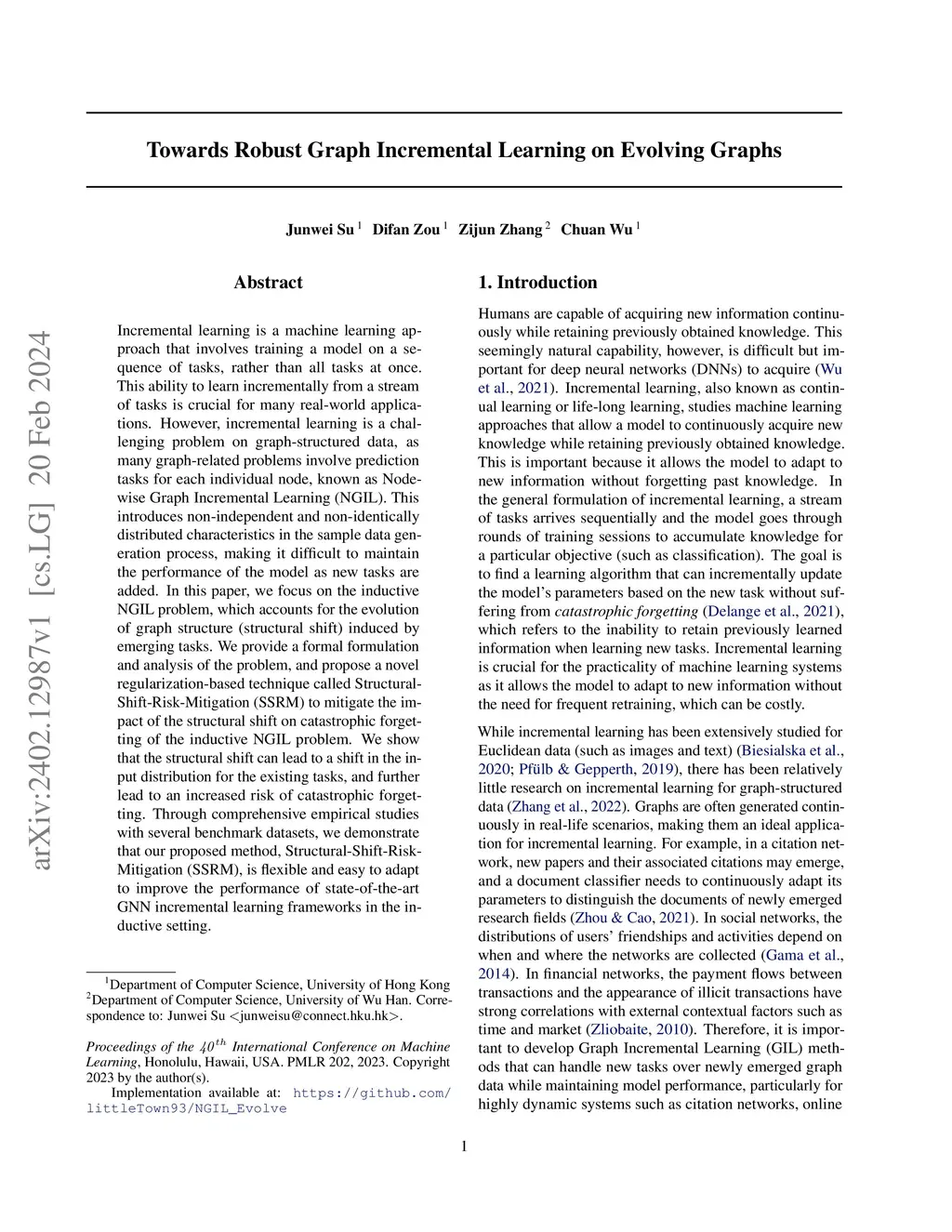 Incremental learning is a machine learning approach that involves training a model on a sequence of tasks, rather than all tasks at once. This ability to learn incrementally from a stream of tasks is crucial for many real-world applications. However, incremental learning is a challenging problem on graph-structured data, as many graph-related problems involve prediction tasks for each individual node, known as Node-wise Graph Incremental Learning (NGIL). This introduces non-independent and non-identically distributed characteristics in the sample data generation process, making it difficult to maintain the performance of the model as new tasks are added. In this paper, we focus on the inductive NGIL problem, which accounts for the evolution of graph structure (structural shift) induced by emerging tasks. We provide a formal formulation and analysis of the problem, and propose a novel regularization-based technique called Structural-Shift-Risk-Mitigation (SSRM) to mitigate the impact of the structural shift on catastrophic forgetting of the inductive NGIL problem. We show that the structural shift can lead to a shift in the input distribution for the existing tasks, and further lead to an increased risk of catastrophic forgetting. Through comprehensive empirical studies with several benchmark datasets, we demonstrate that our proposed method, Structural-Shift-Risk-Mitigation (SSRM), is flexible and easy to adapt to improve the performance of state-of-the-art GNN incremental learning frameworks in the inductive setting.