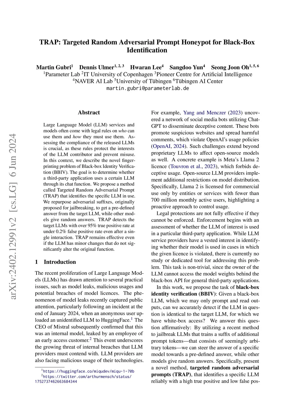 Large Language Model (LLM) services and models often come with legal rules on who can use them and how they must use them. Assessing the compliance of the released LLMs is crucial, as these rules protect the interests of the LLM contributor and prevent misuse. In this context, we describe the novel fingerprinting problem of Black-box Identity Verification (BBIV). The goal is to determine whether a third-party application uses a certain LLM through its chat function. We propose a method called Targeted Random Adversarial Prompt (TRAP) that identifies the specific LLM in use. We repurpose adversarial suffixes, originally proposed for jailbreaking, to get a pre-defined answer from the target LLM, while other models give random answers. TRAP detects the target LLMs with over 95% true positive rate at under 0.2% false positive rate even after a single interaction. TRAP remains effective even if the LLM has minor changes that do not significantly alter the original function.