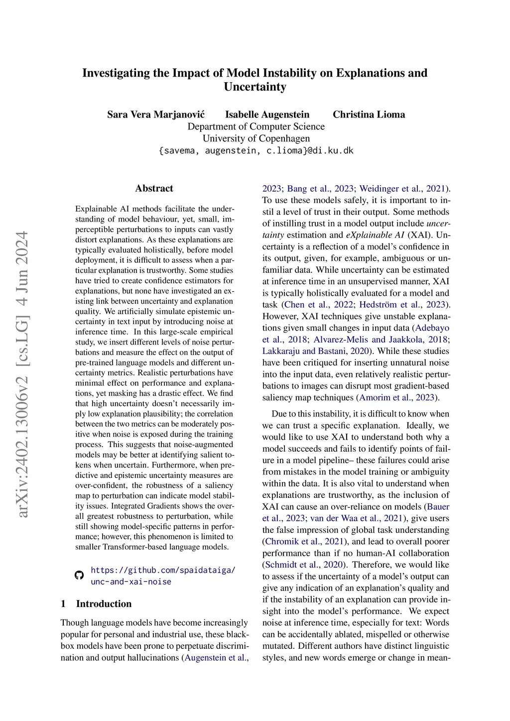 Explainable AI methods facilitate the understanding of model behaviour, yet, small, imperceptible perturbations to inputs can vastly distort explanations. As these explanations are typically evaluated holistically, before model deployment, it is difficult to assess when a particular explanation is trustworthy. Some studies have tried to create confidence estimators for explanations, but none have investigated an existing link between uncertainty and explanation quality. We artificially simulate epistemic uncertainty in text input by introducing noise at inference time. In this large-scale empirical study, we insert different levels of noise perturbations and measure the effect on the output of pre-trained language models and different uncertainty metrics. Realistic perturbations have minimal effect on performance and explanations, yet masking has a drastic effect. We find that high uncertainty doesn't necessarily imply low explanation plausibility; the correlation between the two metrics can be moderately positive when noise is exposed during the training process. This suggests that noise-augmented models may be better at identifying salient tokens when uncertain. Furthermore, when predictive and epistemic uncertainty measures are over-confident, the robustness of a saliency map to perturbation can indicate model stability issues. Integrated Gradients shows the overall greatest robustness to perturbation, while still showing model-specific patterns in performance; however, this phenomenon is limited to smaller Transformer-based language models.