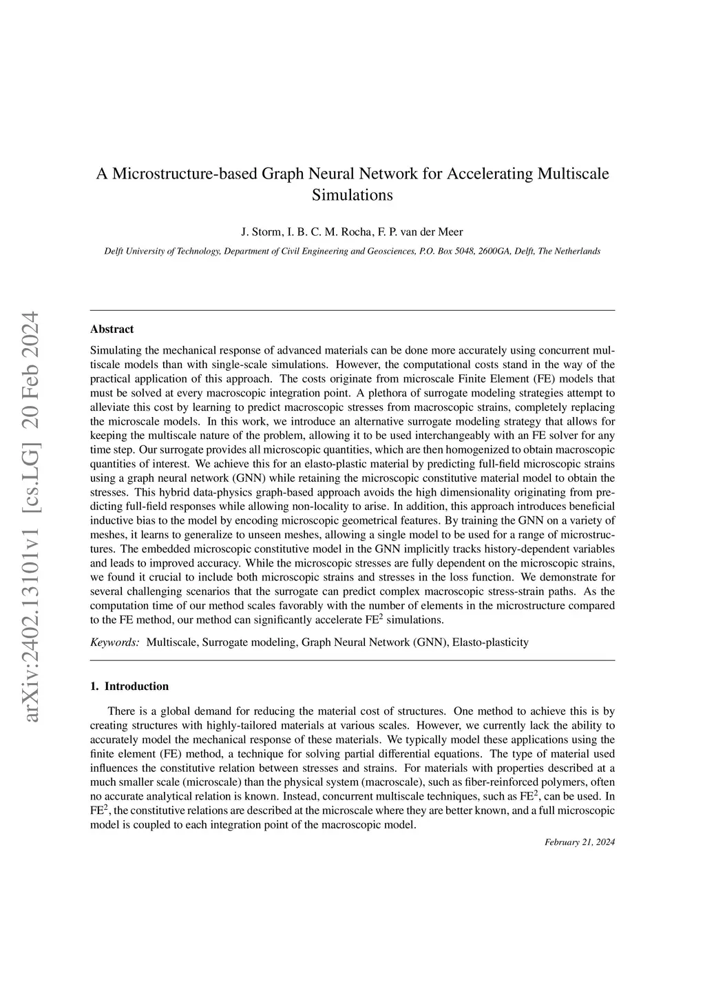 Simulating the mechanical response of advanced materials can be done more accurately using concurrent multiscale models than with single-scale simulations. However, the computational costs stand in the way of the practical application of this approach. The costs originate from microscale Finite Element (FE) models that must be solved at every macroscopic integration point. A plethora of surrogate modeling strategies attempt to alleviate this cost by learning to predict macroscopic stresses from macroscopic strains, completely replacing the microscale models. In this work, we introduce an alternative surrogate modeling strategy that allows for keeping the multiscale nature of the problem, allowing it to be used interchangeably with an FE solver for any time step. Our surrogate provides all microscopic quantities, which are then homogenized to obtain macroscopic quantities of interest. We achieve this for an elasto-plastic material by predicting full-field microscopic strains using a graph neural network (GNN) while retaining the microscopic constitutive material model to obtain the stresses. This hybrid data-physics graph-based approach avoids the high dimensionality originating from predicting full-field responses while allowing non-locality to arise. By training the GNN on a variety of meshes, it learns to generalize to unseen meshes, allowing a single model to be used for a range of microstructures. The embedded microscopic constitutive model in the GNN implicitly tracks history-dependent variables and leads to improved accuracy. We demonstrate for several challenging scenarios that the surrogate can predict complex macroscopic stress-strain paths. As the computation time of our method scales favorably with the number of elements in the microstructure compared to the FE method, our method can significantly accelerate FE2 simulations.