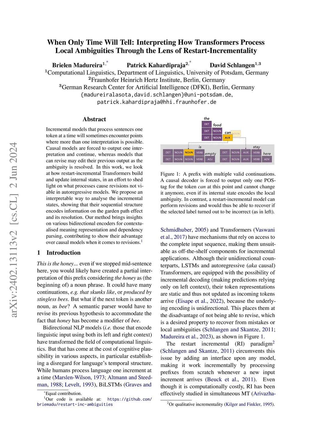 Incremental models that process sentences one token at a time will sometimes encounter points where more than one interpretation is possible. Causal models are forced to output one interpretation and continue, whereas models that can revise may edit their previous output as the ambiguity is resolved. In this work, we look at how restart-incremental Transformers build and update internal states, in an effort to shed light on what processes cause revisions not viable in autoregressive models. We propose an interpretable way to analyse the incremental states, showing that their sequential structure encodes information on the garden path effect and its resolution. Our method brings insights on various bidirectional encoders for contextualised meaning representation and dependency parsing, contributing to show their advantage over causal models when it comes to revisions.