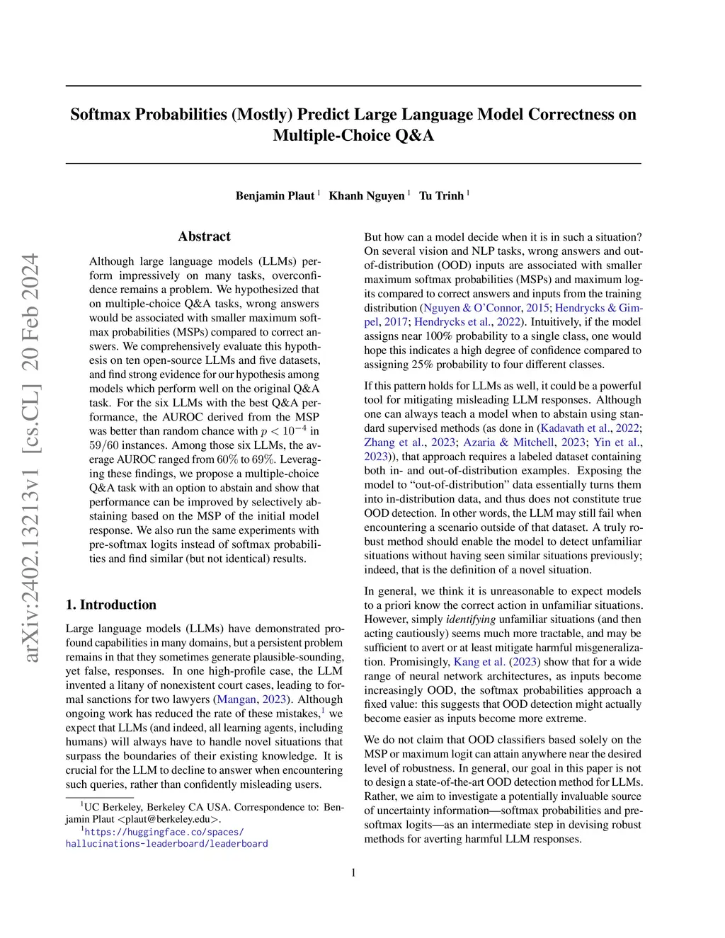 We study 15 large language models (LLMs) fine-tuned for chat and find that their maximum softmax probabilities (MSPs) are consistently miscalibrated on multiple-choice Q&A. However, those MSPs might still encode useful uncertainty information. Specifically, we hypothesized that wrong answers would be associated with smaller MSPs compared to correct answers. Via rigorous statistical testing, we show that this hypothesis holds for models which perform well on the underlying Q&A task. We also find a strong direction correlation between Q&A accuracy and MSP correctness prediction, while finding no correlation between Q&A accuracy and calibration error. This suggests that within the current fine-tuning paradigm, we can expect correctness prediction but not calibration to improve as LLM capabilities progress. To demonstrate the utility of correctness prediction, we show that when models have the option to abstain, performance can be improved by selectively abstaining based on the MSP of the initial model response, using only a small amount of labeled data to choose the MSP threshold.