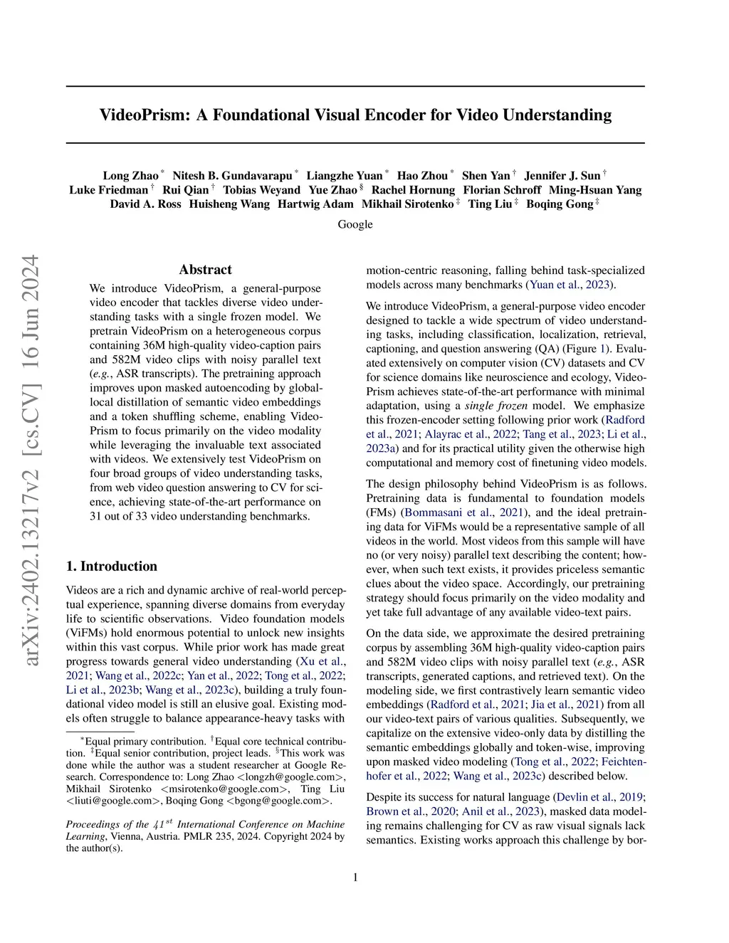 We introduce VideoPrism, a general-purpose video encoder that tackles diverse video understanding tasks with a single frozen model. We pretrain VideoPrism on a heterogeneous corpus containing 36M high-quality video-caption pairs and 582M video clips with noisy parallel text (e.g., ASR transcripts). The pretraining approach improves upon masked autoencoding by global-local distillation of semantic video embeddings and a token shuffling scheme, enabling VideoPrism to focus primarily on the video modality while leveraging the invaluable text associated with videos. We extensively test VideoPrism on four broad groups of video understanding tasks, from web video question answering to CV for science, achieving state-of-the-art performance on 31 out of 33 video understanding benchmarks. Our models are released atthis https URL.