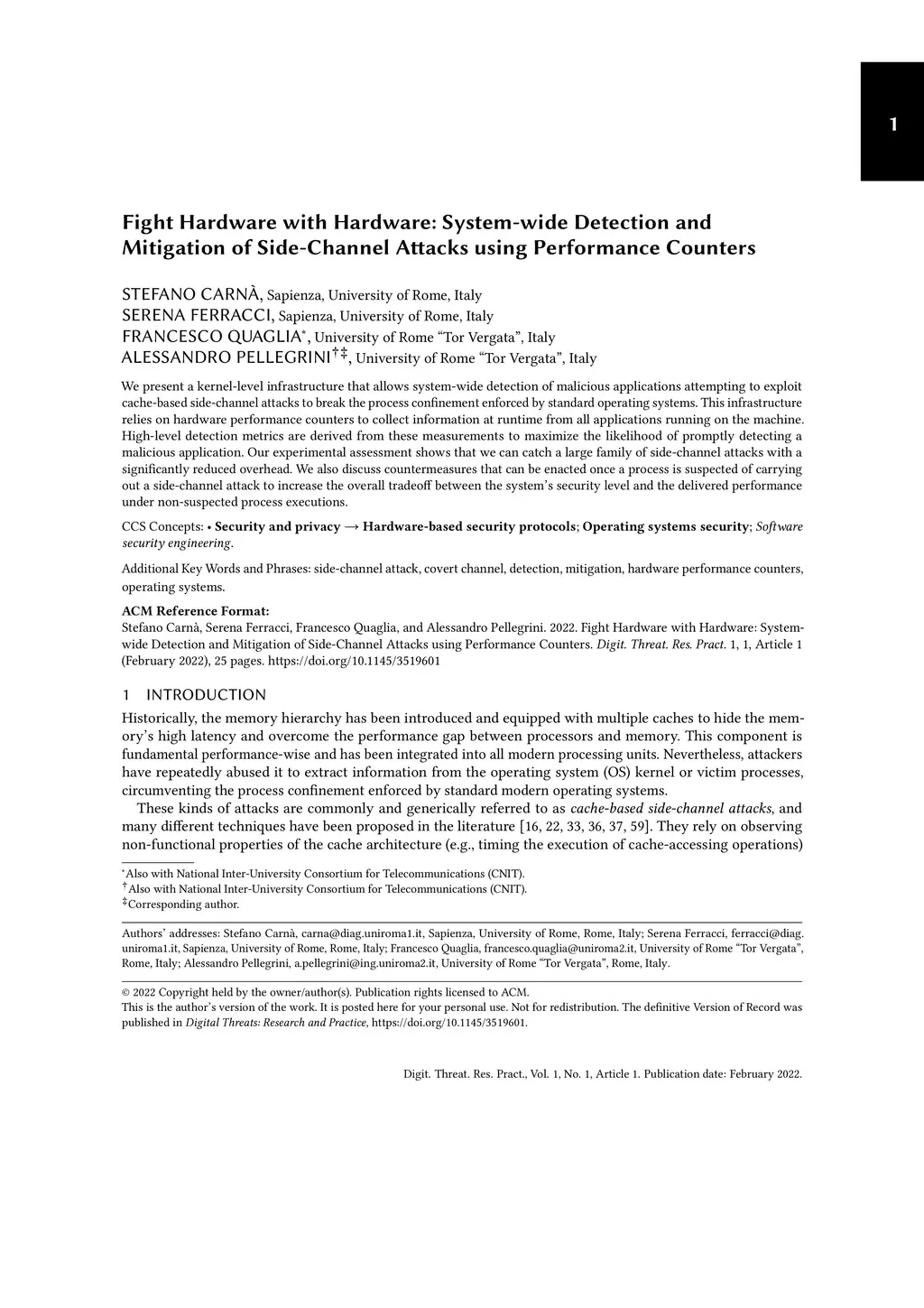 We present a kernel-level infrastructure that allows system-wide detection of malicious applications attempting to exploit cache-based side-channel attacks to break the process confinement enforced by standard operating systems. This infrastructure relies on hardware performance counters to collect information at runtime from all applications running on the machine. High-level detection metrics are derived from these measurements to maximize the likelihood of promptly detecting a malicious application. Our experimental assessment shows that we can catch a large family of side-channel attacks with a significantly reduced overhead. We also discuss countermeasures that can be enacted once a process is suspected of carrying out a side-channel attack to increase the overall tradeoff between the system's security level and the delivered performance under non-suspected process executions.