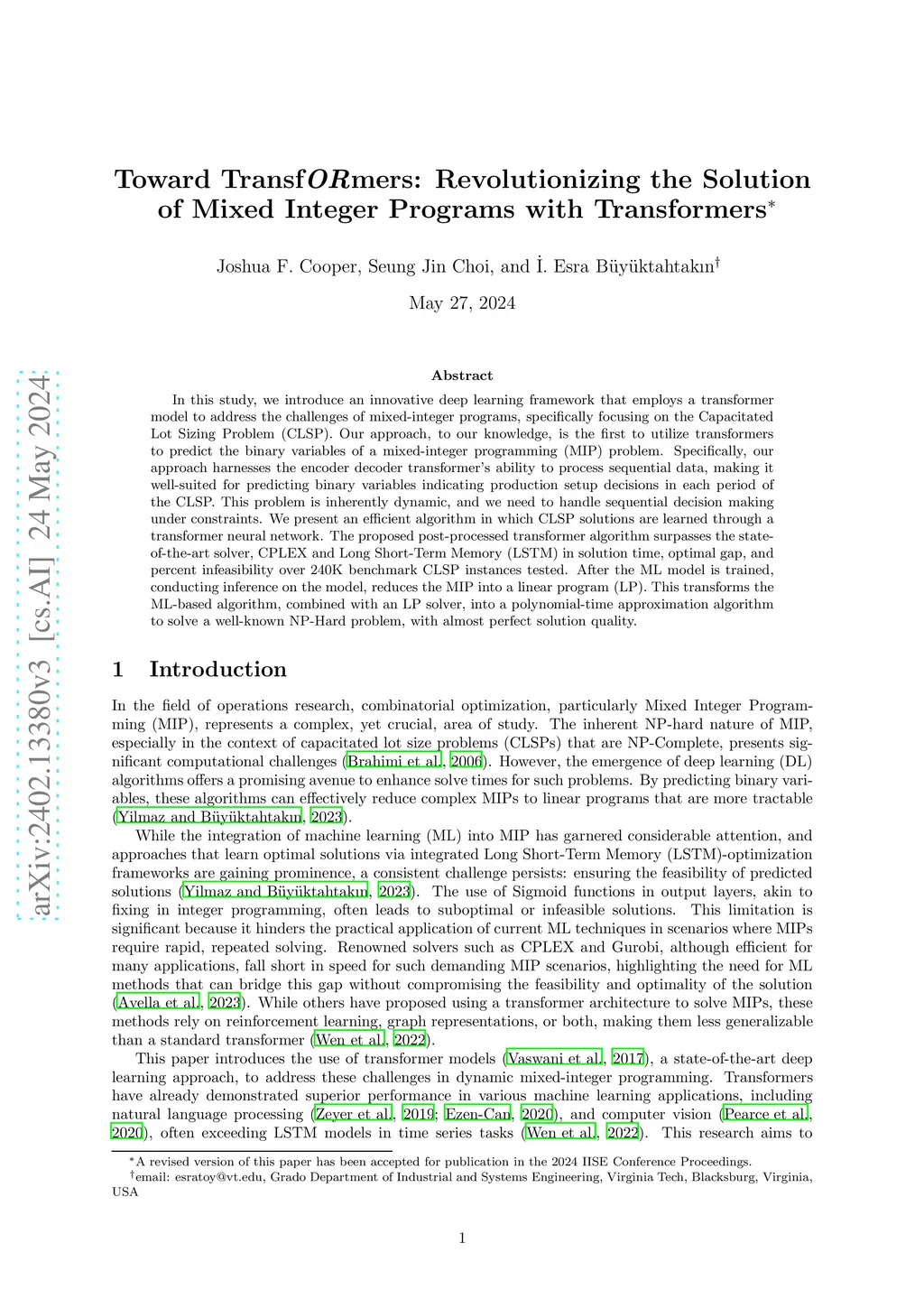 In this study, we introduce an innovative deep learning framework that employs a transformer model to address the challenges of mixed-integer programs, specifically focusing on the Capacitated Lot Sizing Problem (CLSP). Our approach, to our knowledge, is the first to utilize transformers to predict the binary variables of a mixed-integer programming (MIP) problem. Specifically, our approach harnesses the encoder decoder transformer's ability to process sequential data, making it well-suited for predicting binary variables indicating production setup decisions in each period of the CLSP. This problem is inherently dynamic, and we need to handle sequential decision making under constraints. We present an efficient algorithm in which CLSP solutions are learned through a transformer neural network. The proposed post-processed transformer algorithm surpasses the state-of-the-art solver, CPLEX and Long Short-Term Memory (LSTM) in solution time, optimal gap, and percent infeasibility over 240K benchmark CLSP instances tested. After the ML model is trained, conducting inference on the model, reduces the MIP into a linear program (LP). This transforms the ML-based algorithm, combined with an LP solver, into a polynomial-time approximation algorithm to solve a well-known NP-Hard problem, with almost perfect solution quality.