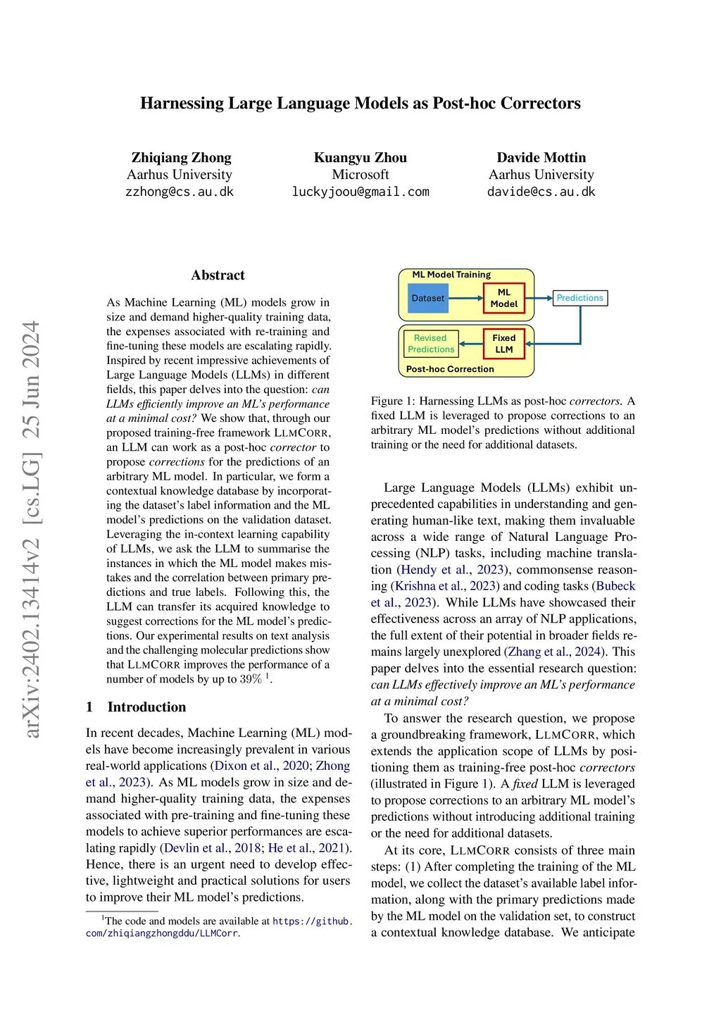 As Machine Learning (ML) models grow in size and demand higher-quality training data, the expenses associated with re-training and fine-tuning these models are escalating rapidly. Inspired by recent impressive achievements of Large Language Models (LLMs) in different fields, this paper delves into the question: can LLMs efficiently improve an ML's performance at a minimal cost? We show that, through our proposed training-free framework LlmCorr, an LLM can work as a post-hoc corrector to propose corrections for the predictions of an arbitrary ML model. In particular, we form a contextual knowledge database by incorporating the dataset's label information and the ML model's predictions on the validation dataset. Leveraging the in-context learning capability of LLMs, we ask the LLM to summarise the instances in which the ML model makes mistakes and the correlation between primary predictions and true labels. Following this, the LLM can transfer its acquired knowledge to suggest corrections for the ML model's predictions. Our experimental results on text analysis and the challenging molecular predictions show that \model improves the performance of a number of models by up to 39%.