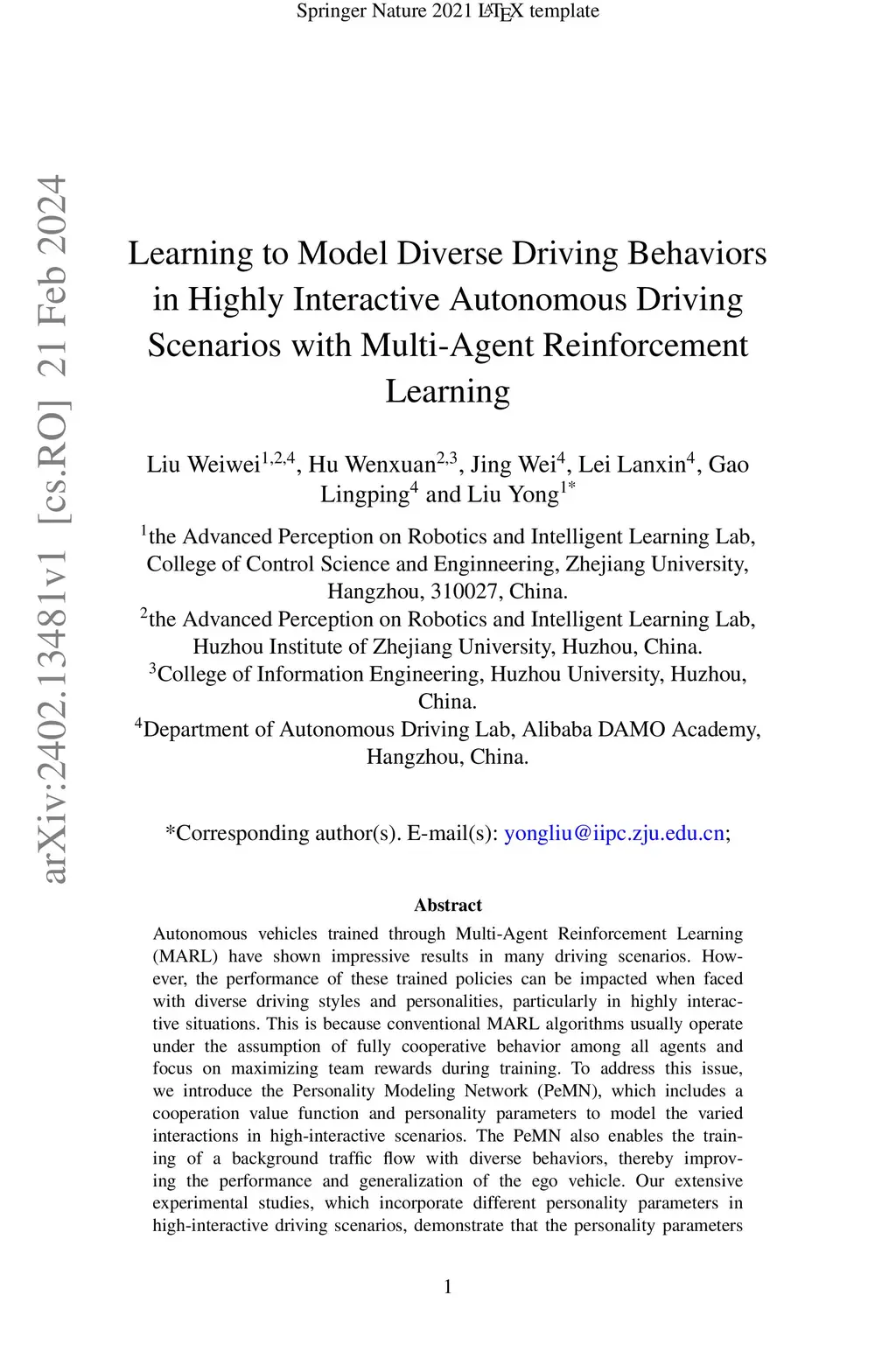 Autonomous vehicles trained through Multi-Agent Reinforcement Learning (MARL) have shown impressive results in many driving scenarios. However, the performance of these trained policies can be impacted when faced with diverse driving styles and personalities, particularly in highly interactive situations. This is because conventional MARL algorithms usually operate under the assumption of fully cooperative behavior among all agents and focus on maximizing team rewards during training. To address this issue, we introduce the Personality Modeling Network (PeMN), which includes a cooperation value function and personality parameters to model the varied interactions in high-interactive scenarios. The PeMN also enables the training of a background traffic flow with diverse behaviors, thereby improving the performance and generalization of the ego vehicle. Our extensive experimental studies, which incorporate different personality parameters in high-interactive driving scenarios, demonstrate that the personality parameters effectively model diverse driving styles and that policies trained with PeMN demonstrate better generalization compared to traditional MARL methods.
